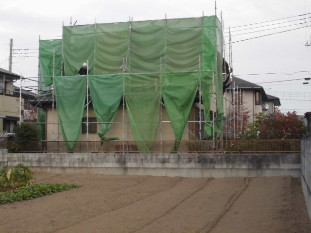 工事中はメッシュシートに覆われ、足場に階段もつきますので、防犯対策になるように