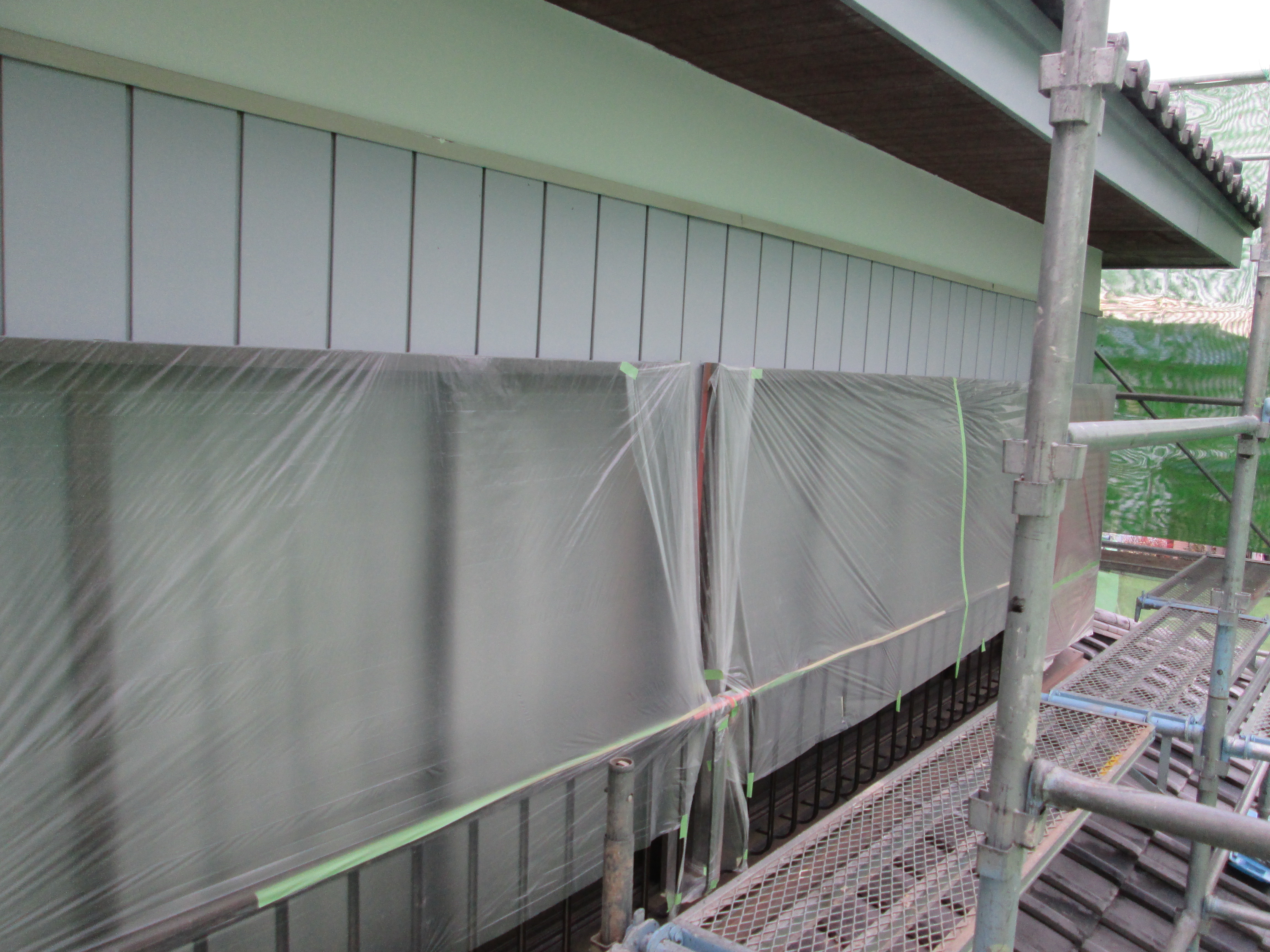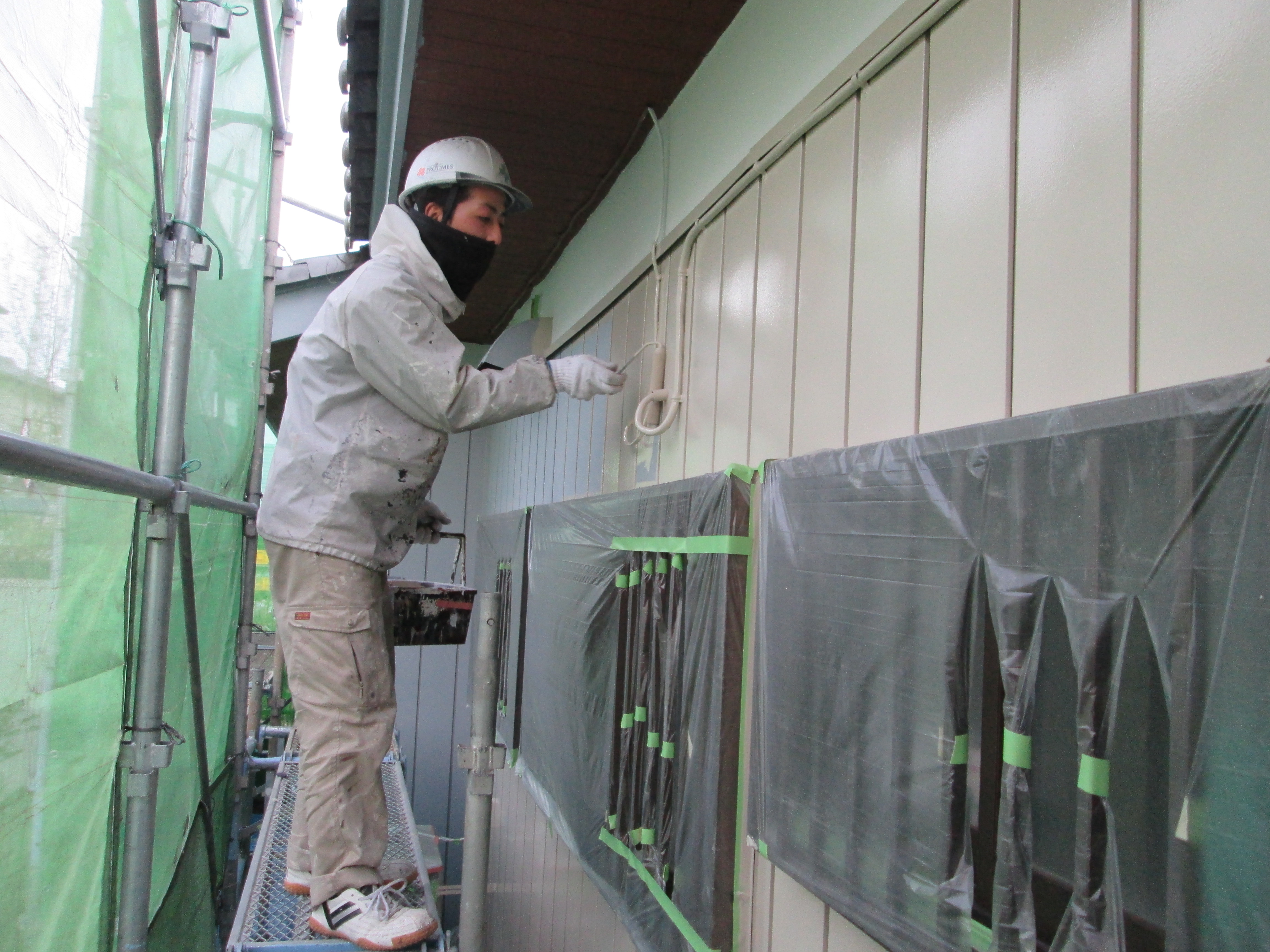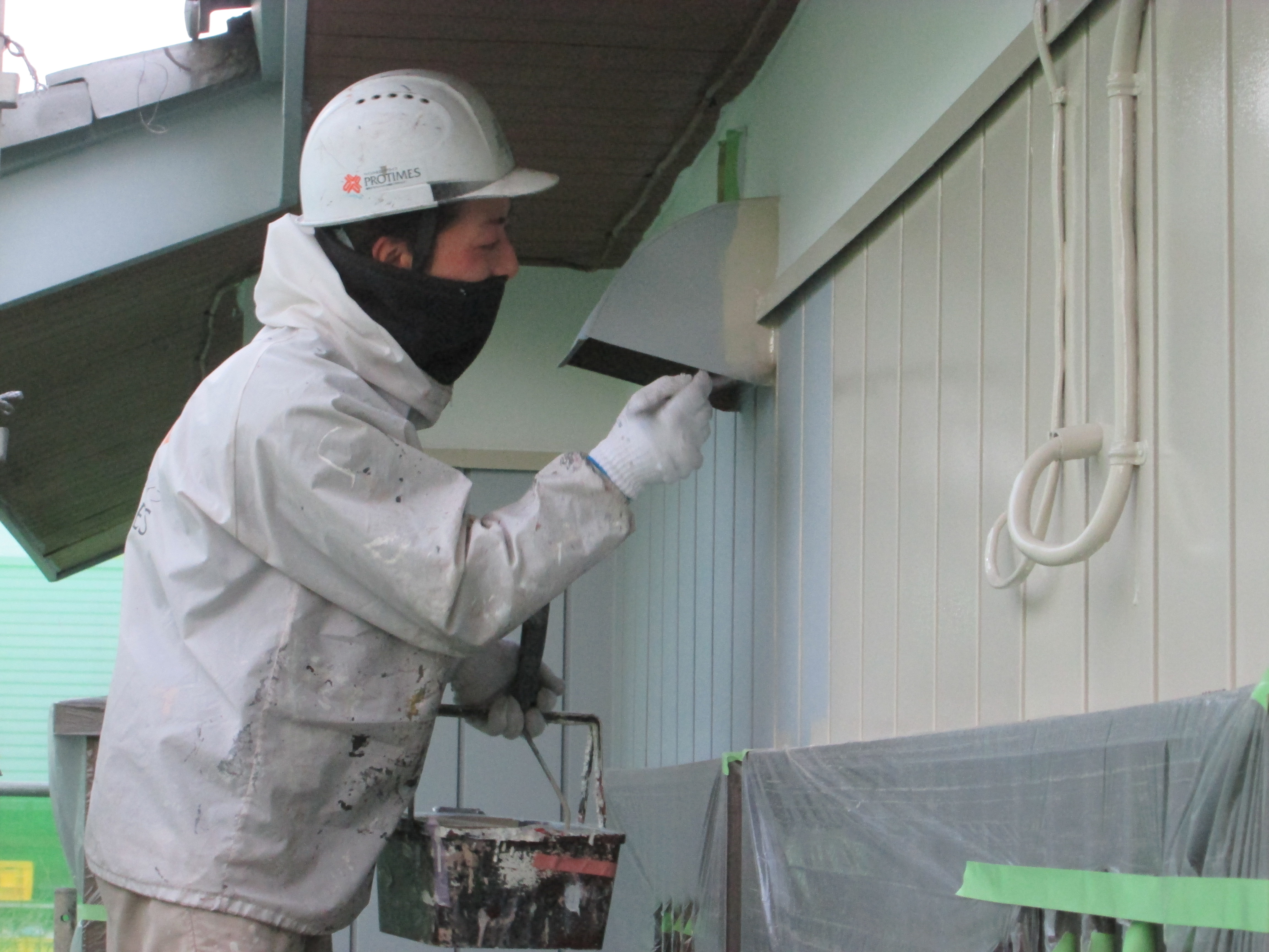 外壁(金属サイディング)の下塗り、中塗り作業を行っていました。
