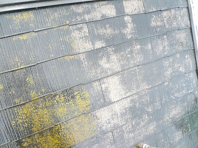白くなっているところはコケがあったところです。もうすでに塗膜が剥がれていますね。