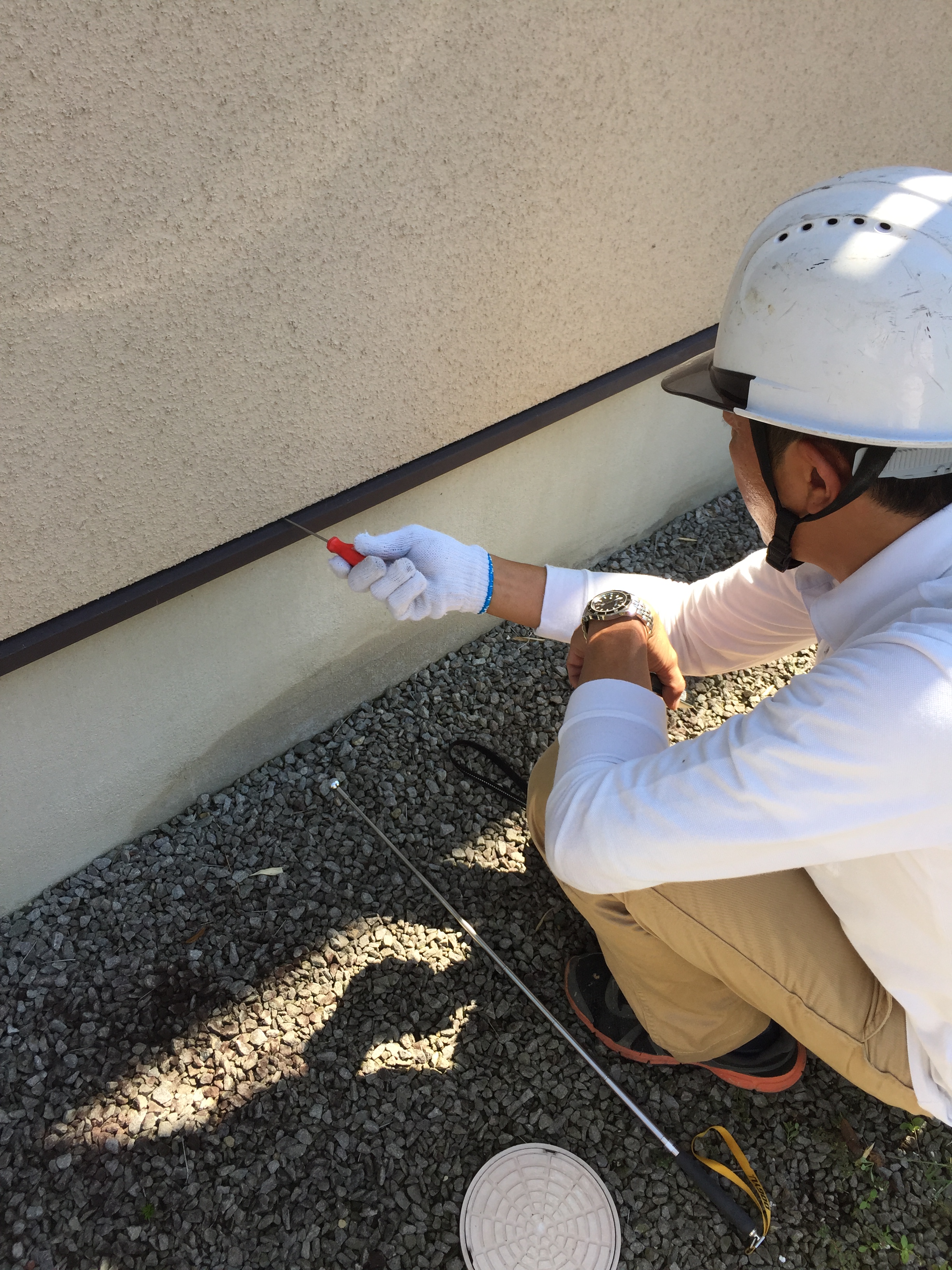 打診棒を使い壁をたたいて応答音を聞き分け欠陥部や外壁が水分を含んでいないかを把握する方法です