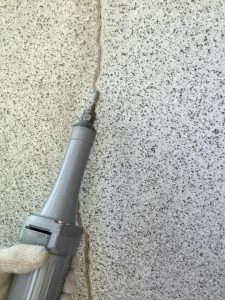 これはコーキングの充填箇所だけに吹き付け塗装をする事はできませんので、周囲の既存の塗膜を削ります。