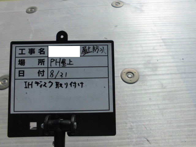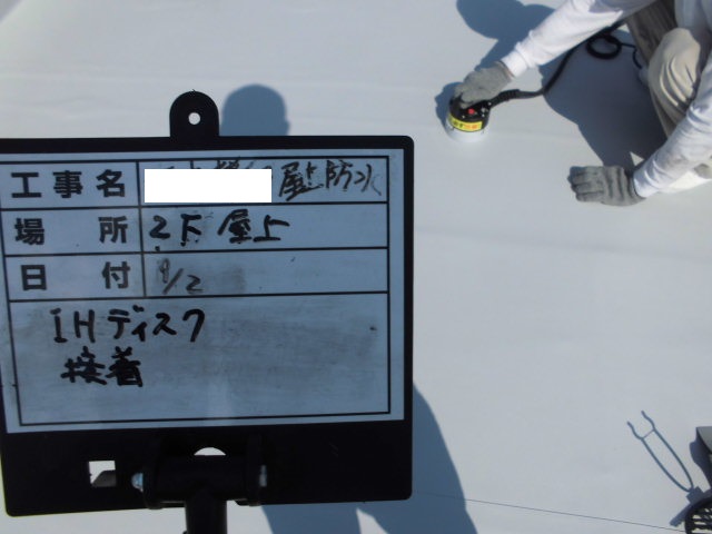 防水シートを屋上に対して「IHディスク」という「点」で固定していきますのでシートが前面に接合しないので屋上面の劣化が防水シートに及びにくいというメリットがあります。