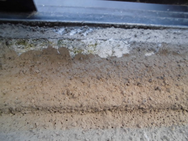 湿気が多くたまるところ。塗膜が剥がれ、ALCがむき出しになってます。