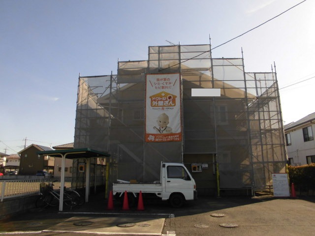 昨日高圧洗浄が終了し、今日から養生作業。