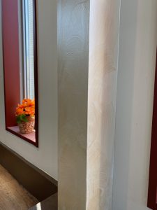 そして、アクセントに壁の柱の部分だけを内装用水性特殊多彩意匠仕上げ材で塗装しました。