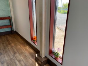 天井は薄いグリーンで塗装し、窓枠は茶に近い赤で塗装しました。