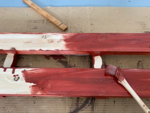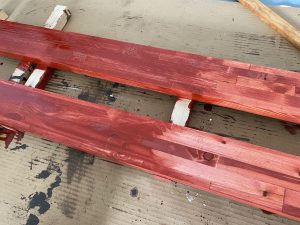 それから棚を制作。柱になる部分は同じ塗料のレッドを使用しました。