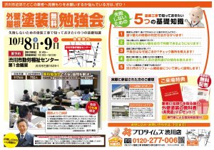 これから塗装シーズンを迎えるという事で 10月は「セミナー」や「相談会」を積極的に 開催していきますので 「イベント開催情報」をお見逃しなく ぜひこの機会にご参加くださいヾ(≧▽≦)ノ 10月開催の「屋根外壁塗り替えセミナー」は下記のとおりです。 「イベント開催情報」をクリックすると予約できます。 又はお電話でご予約下さい。   【外壁屋根塗装勉強会】開催!! ※開催実績117回目/累計受講人数752人※ 開催日時:10月8日㊏ 10月9日㊐ 両日共:10:00~12:00(受付9:45~) 開催場所:渋川市勤労福祉センター(第1会議室) 講師:金井 暁生(一級塗装技能士・外壁劣化診断士・雨漏り診断士・職業訓練指導員) 要予約:0120-277-006またはホームページhttps://www.kanaikenso.jp/cms/ からお申し込みください。 「無料勉強会で塗り替えに関しての不安や疑問を解決!」 こんな方はぜひ ➀業者さんが来て、急いでやらないと!と急かされた ②3社に見積を依頼したら価格がバラバラ・・・ ③リフォーム補助金て塗装でも使えるの?(渋川市のリフォーム補助金について詳しくお話します) ④塗装工事の不具合はなぜ起こるのか知りたい ⑤最新の塗料が知りたい などなど・・・・皆様のご質問・疑問にお答えします。お気軽にご参加ください。 ※勉強会場におけるコロナ対策について ●運営スタッフにおける検温・マスク着用・アルコール消毒の徹底 ●定期的な会場の換気 ●ご参加者様同士の距離は2m以上間隔をあけて運営