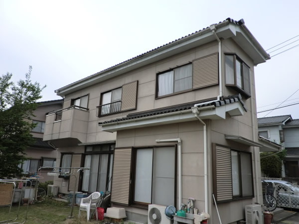 外壁の素材(ALC)自体、気泡性コンクリートということもあり、年数が経ち塗膜の機能を果たさなくなると水分を含んでしまう特性があります。 I様邸はそのせいで外壁にクラックも見られました。また雨水が軒天井に漏れ染みになっていましたので補修し、一部樋の交換、瓦の漆喰も補修しました。 施工前、ベランダの鉄部からの雨染みが目立っていました。 今回選んで頂いた色がライトクリーム系でしたので、塗料はセルフクリーニング機能を持つ「ナノコンポジェット」を提案させて頂きました。破風板、軒天はホワイト色で塗装し、とても明るいヨーロピアンな感じに仕上がりました。