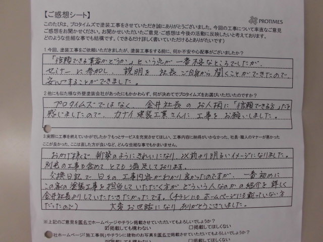 Y様:プロタイムズではなく、社長のお人柄に「信頼できる方」だと感じましたのでカナイ建装工業さんに工事をお願いしました。