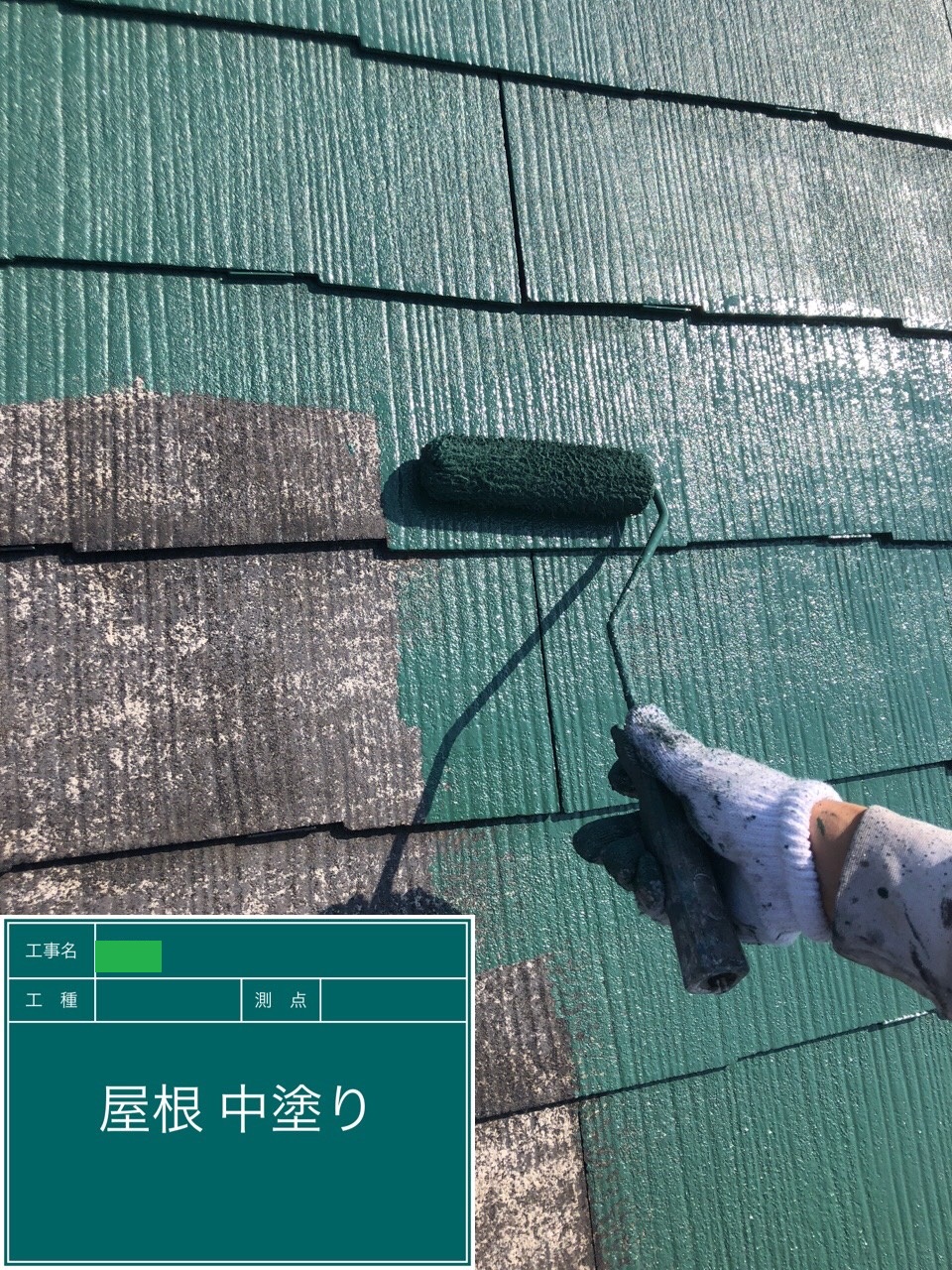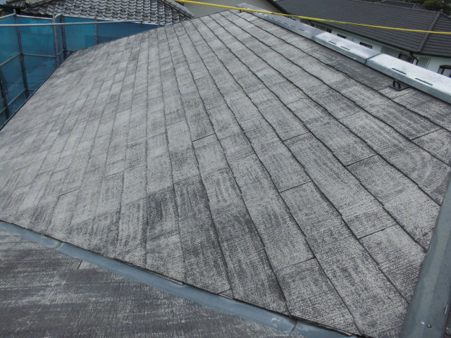 屋根はスレート瓦、外壁は金属サイディングです。屋根は経年劣化により(スレート瓦に良くある)棟板金の色褪せ、瓦の割れ、カビコケの繁殖が見られました。高圧洗浄でカビコケを綺麗に落とすと全体的に旧塗膜が無く瓦の素地が見える状態でした。下塗り材の吸い込みも激しい状態でしたので下塗りを2回施し、中塗り、上塗り(上塗り材2回塗布)と進めていきました。