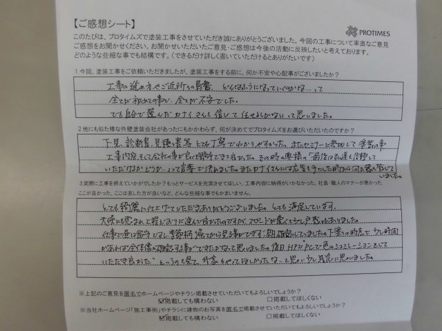 T様:下見、診断書、見積書等とても丁寧で分かりやすかった。またセミナーに参加して 塗装の事、工事内容、そして会社の事が良く理解できて良かった。その時の奥様の「最後は私達を信頼していただけるかどうか・・・」って言葉で決めました。またカナイさんには広告を手にした時から何か縁を感じていました。