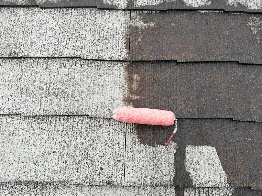 屋根はスレート瓦。経年劣化により塗膜の機能がほとんど果たされておらず、雨水などの水分を吸収しやすい状態でしたので、カビ・コケの繁殖が多く見られました。外壁はチョーキング現象やコーキング部の割れ、常に日の当たらない箇所には苔の繁殖が見られました。