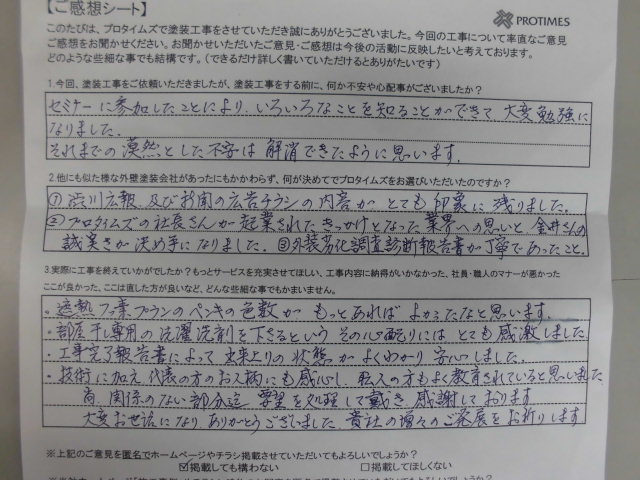 F様:遮熱フッ素プランのペンキの色数がもっとあればよかったなと思います。部屋干し専用の洗濯洗剤を下さるという その心配りに感激しました。工事完了報告書によって出来上がりの状態がよくわかり安心しました。技術に加え、代表の方のお人柄にも感心し、職人の方も良く教育されていると思いました。尚、関係のない部分迄要望を処理して頂き、感謝しております。大変お世話になりました。貴社の増々のご発展をお祈りします。