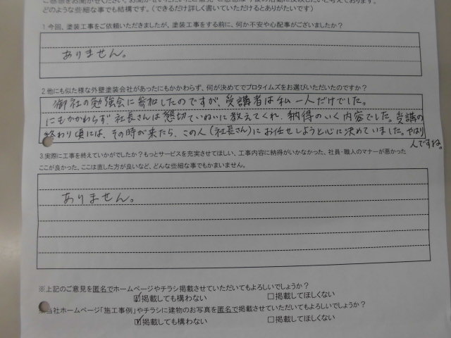 Q:実際に工事を終えて以下がでしたか?もっとサービスを充実させてほしい、工事内容に納得がいかなかった、社員、職人のマナーが悪かった、ここが良かった、ここは直したほうが良いなど、どんな些細な事でもかまいません。