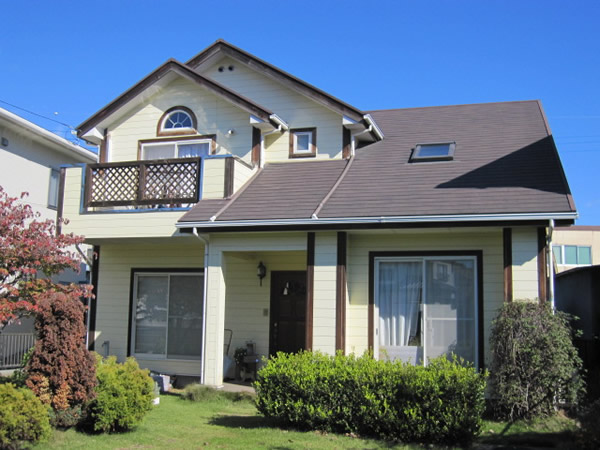 M様邸は陽当たりが良いため特に南面の破風板は大きく反っていました。 そこで反りが著しい箇所については板を交換のうえ板金巻きで仕上げる事をご提案させて頂きました。 また、家の四隅など木柱で装飾されている所が数多くあり木部の劣化箇所(ヒビ割れ)はコーキングで補修し水の浸入を防ぎました。