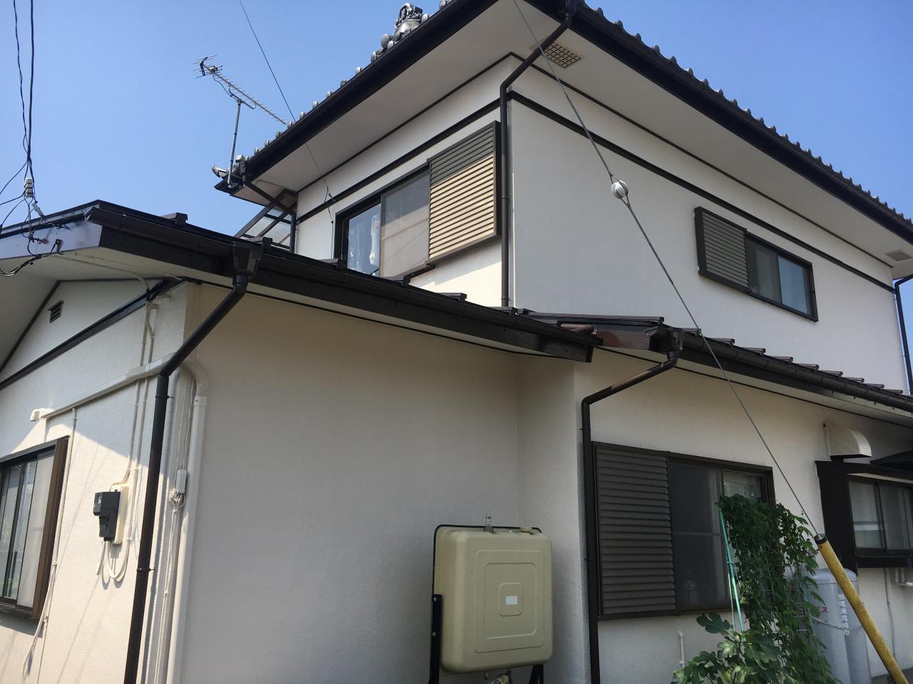外壁塗装とトタン屋根部塗装、雨樋交換工事を行いました。塗装前と同じ感じの色をお選びいただき新築時のように綺麗になりました。塗料は、「ラジカル制御」技術(紫外線による塗膜劣化対策)によりシリコングレードを超える非常にすぐれた耐久性がある、人気のパーフェクトトップを使用しました。