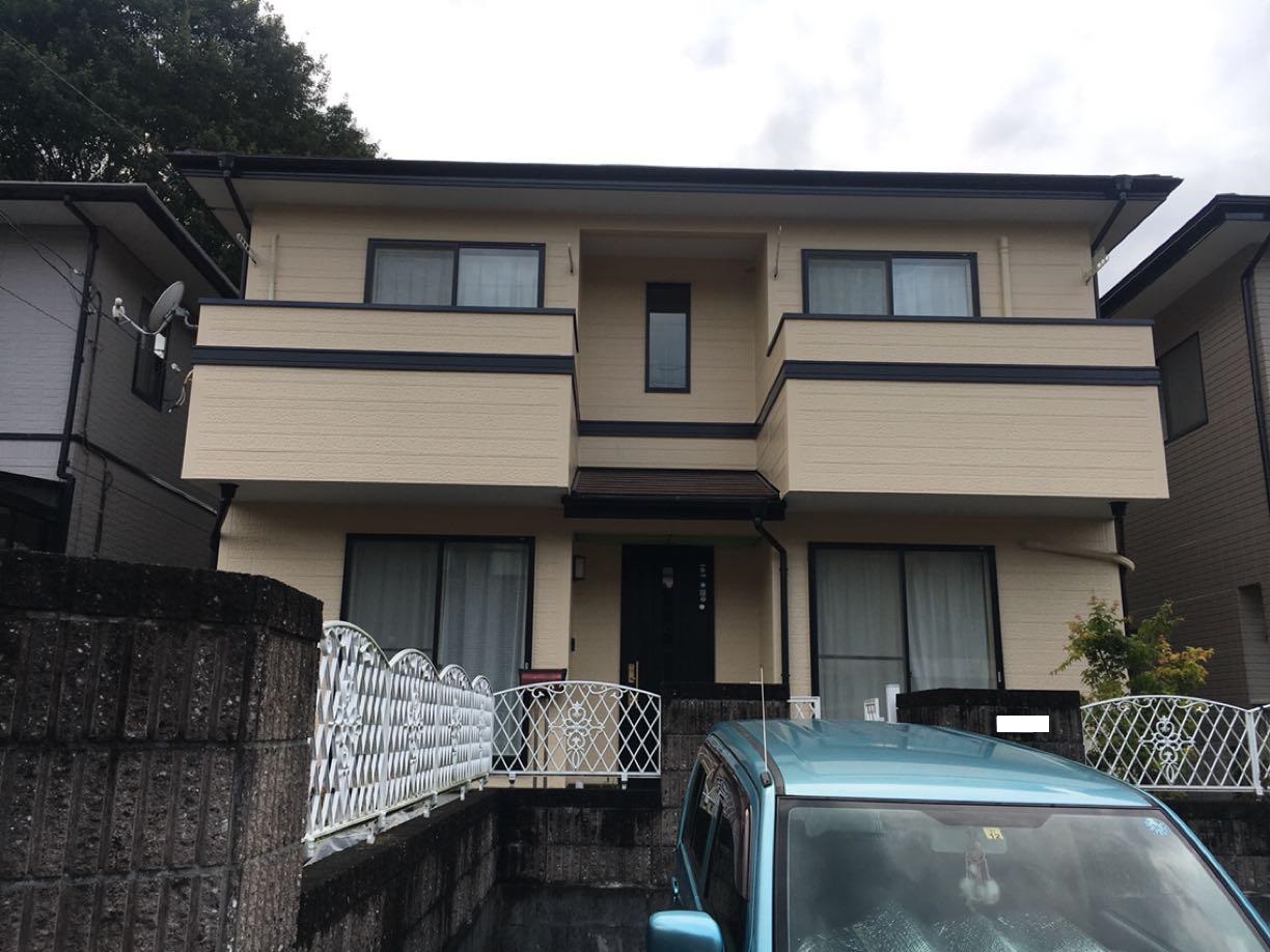 高圧洗浄にてカビコケを入念に洗浄し、屋根は劣化により、下塗りの吸い込みが激しい状態でしたので下塗り材を2回塗布。棟板金部は錆止めを塗布してから塗装しました。外壁はところどころにサイディング板のひび割れがありましたので下地処理してから塗装しました。屋根は遮熱機能を兼ね備えたアステックペイントのエコ塗料、スーパーシャネツサーモを使用。外壁は紫外線により発生する劣化因子「ラジカル」の発生を抑える機能を備えた関西ペイントのダイナミックTOPを使用。シリコングレードを超え長期に渡り紫外線から外壁を守ります。色は屋根、外壁共に暖かみのある色をお選びいただき、幕板とサッシの色がバランスよく明るい外観に仕上がりました。