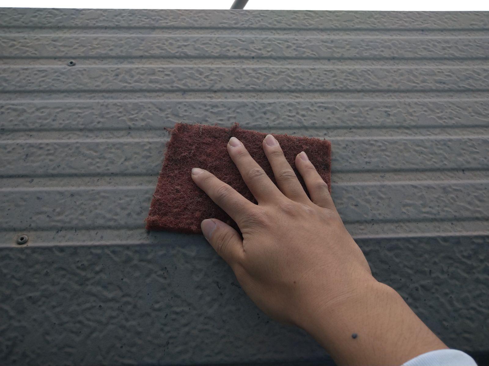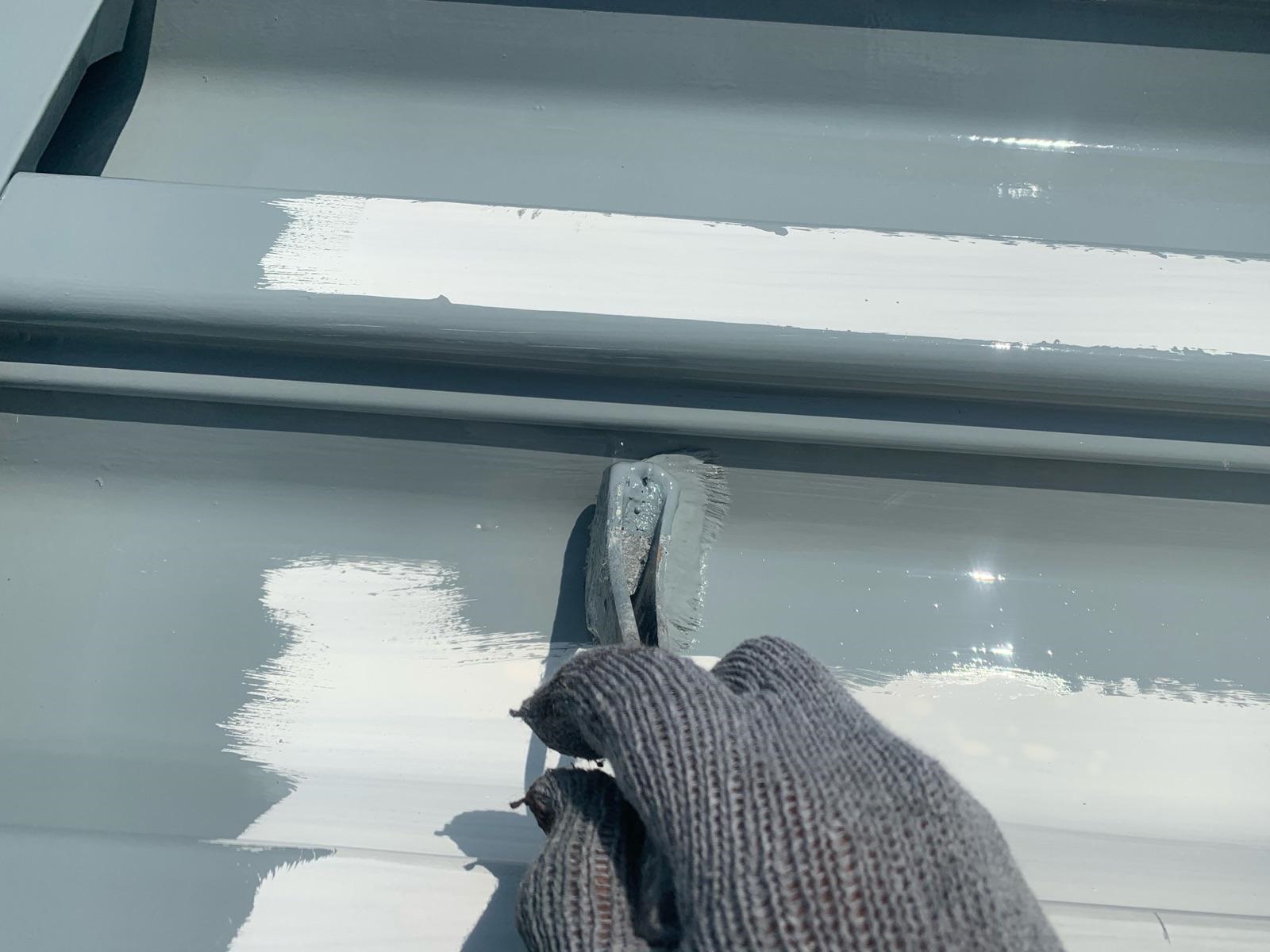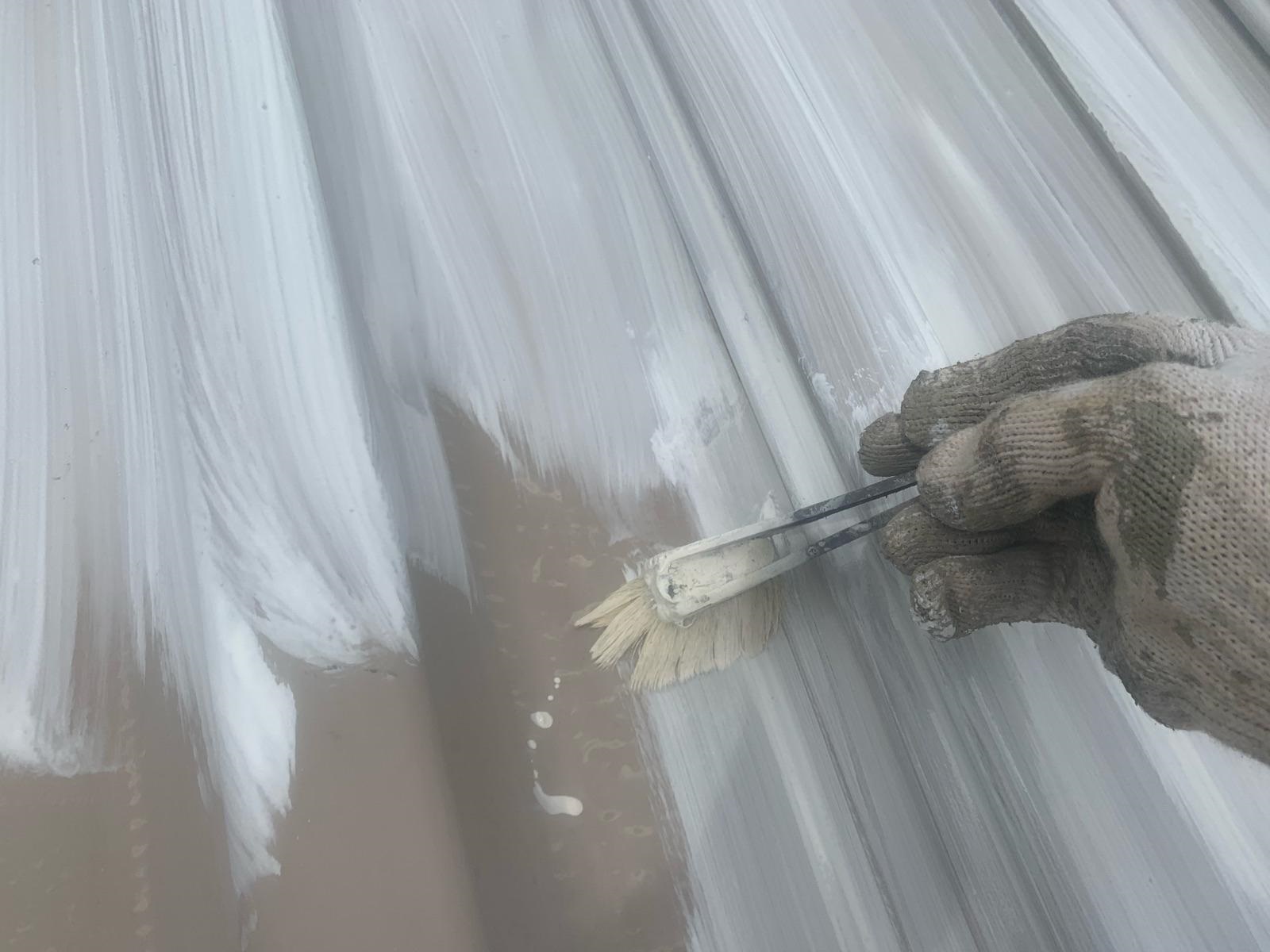 以前塗装工事をさせて頂いたお客様からのご紹介で、現場調査、お見積りをさせて頂きました。金属屋根、金属サイディングでしたので、高圧洗浄した後、各所ケレン(研磨)作業を行い、塗料が密着しやすい下地にした後、錆止めを塗布。上塗り材を2回塗布しました。また、建物が金属製でしたので熱伝導率を考慮した上、屋根外壁ともに遮熱塗料を使用しました。屋根の色は9110クレタグレー。濃い色よりも熱の反射率が高くなりより一層の遮熱機能が期待できます。外壁は少しグレーがかったベージュ系の8112チーノを使用。破風板や幕板を少し濃い目の8077ヤララブラウンでアクセントにし、全体を引き締めました。品があり、落ち着きのある外観に仕上がりました。