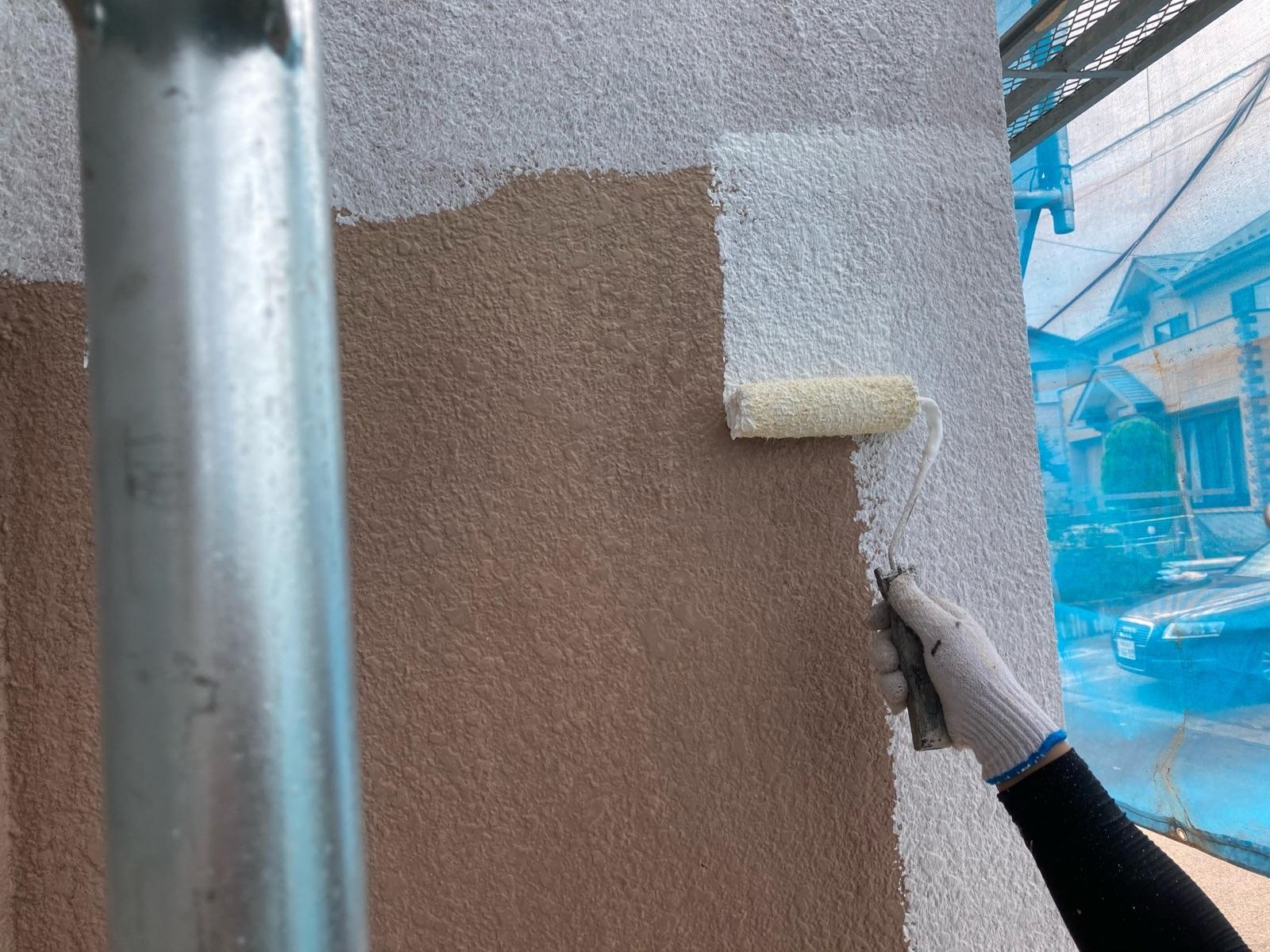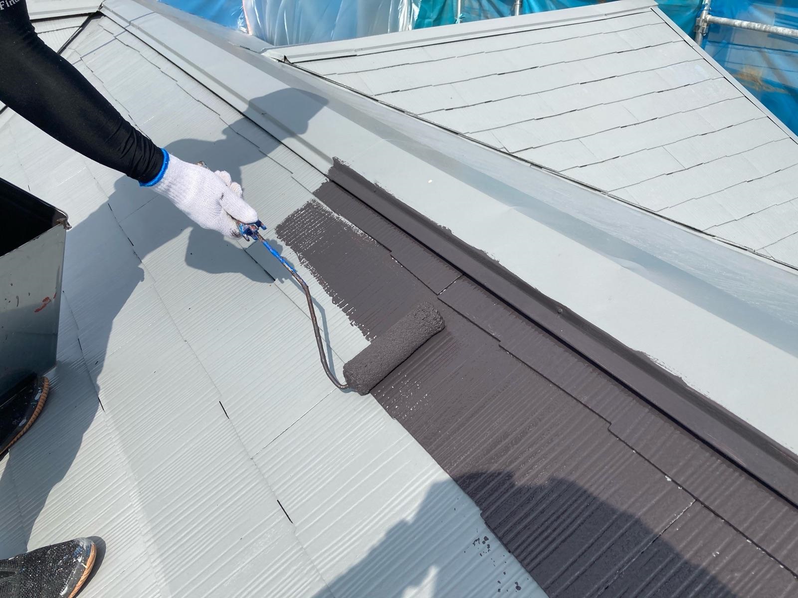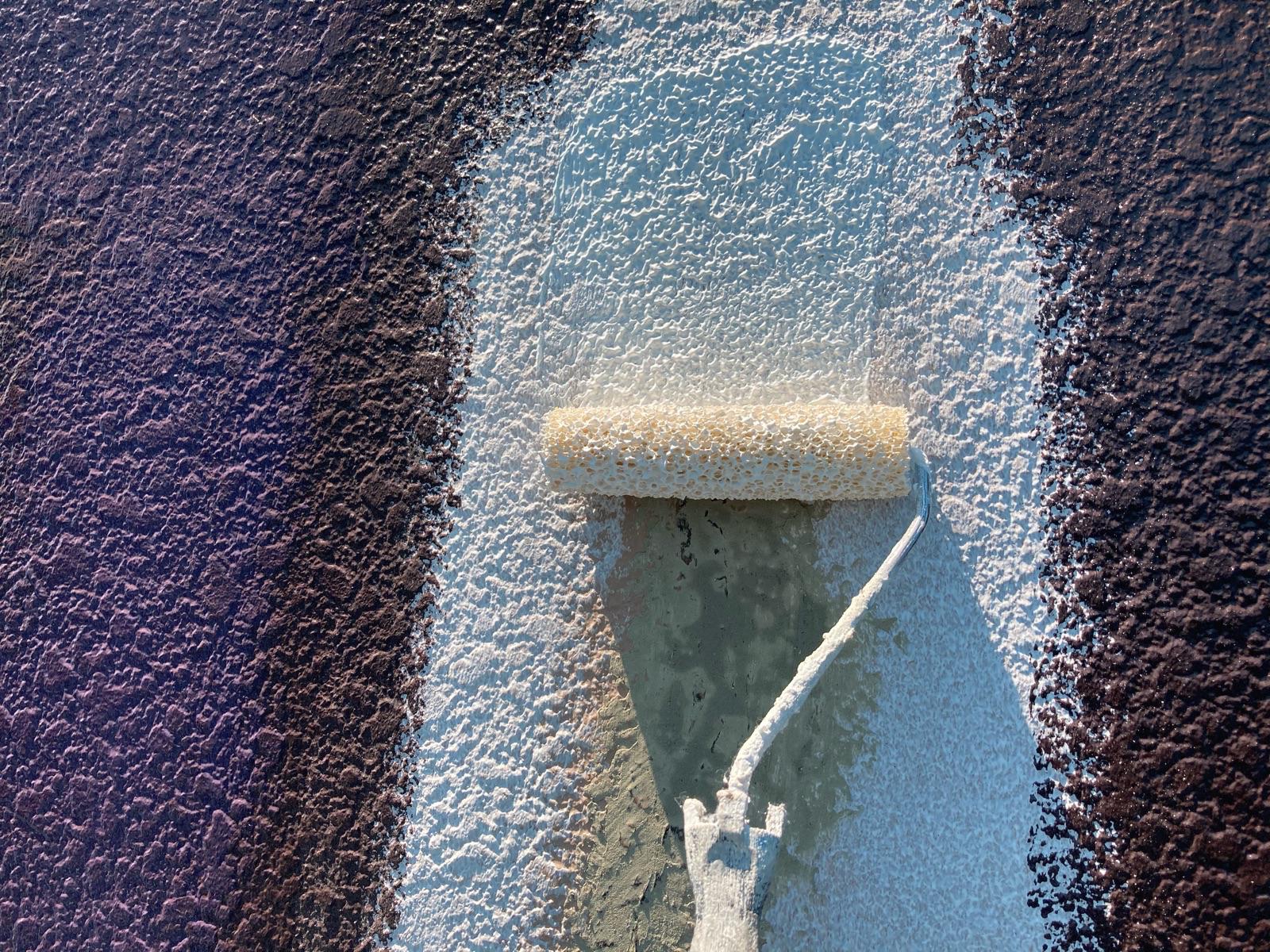 屋根は毛細管現象による雨漏れを防ぐ為、タスペーサー(縁切り部材)を挿入し塗装しました。外壁はクラック(ひび割れ)箇所は下地補修をした後塗装。屋根はアステックペイントの遮熱機能を兼ね備えたフッ素塗料シャネツサーモFを使用。色はブラックに近いブラウンで9114キャビアブラウンを使用。外壁は屋根同様、アステックペイントの汚れが付きにくい超低汚染塗料、プラチナリファイン2000MFを使用しデザイン塗装しました。カラーシュミレーションで2パターン作成し、お施主様に選んで頂きました。1階、2階、玄関廻りのサイディング外壁と色を分け、玄関廻りの外壁は3色使いました。1階モルタル部は8075パイオニア、2階は9010クールホワイト、玄関廻りは8076リーガルブラウン、8071クレイトーン、8070テラコッタ。2階にホワイトを使用したことで重くなりすぎない統一感のある外観に。また玄関廻りのサイディングがポイントになり、落ち着いた雰囲気に仕上がり、お施主様にもとても気に入って頂けました。