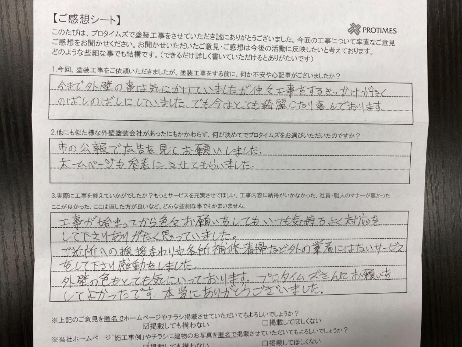 外壁の色もとても気に入っております。プロタイムズさんにお願いして良かったです。