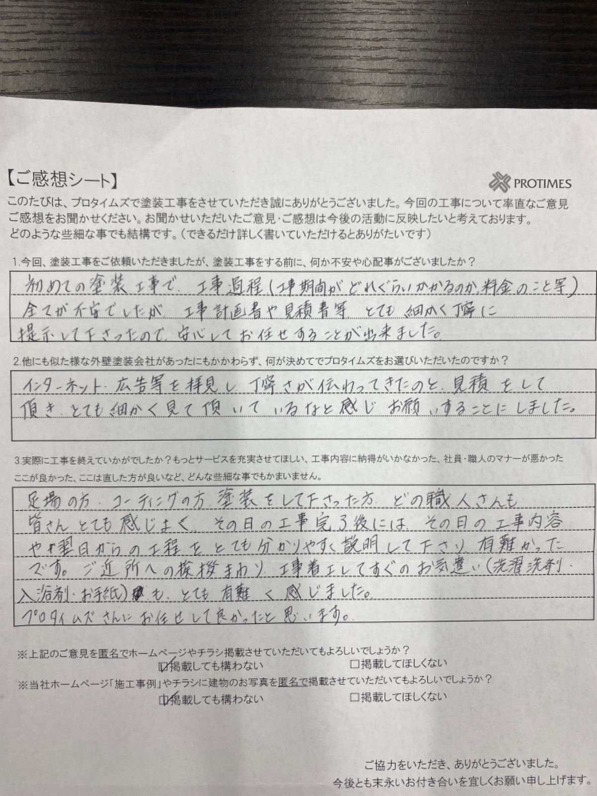 O様:足場の方、コーキングの方、塗装をして下さった方、どの職人さんも皆さんとても感じが良く、その日の工事完了後には、その日の工事内容や翌日からの工程をとても分かりやすく説明してくださり、ありがたかったです。ご近所への挨拶まわり、工事着工してすぐのお気遣い(洗濯洗剤、入浴剤、お手紙)もとても有り難く感じました。プロタイムズさんにお任せして良かったと思います。
