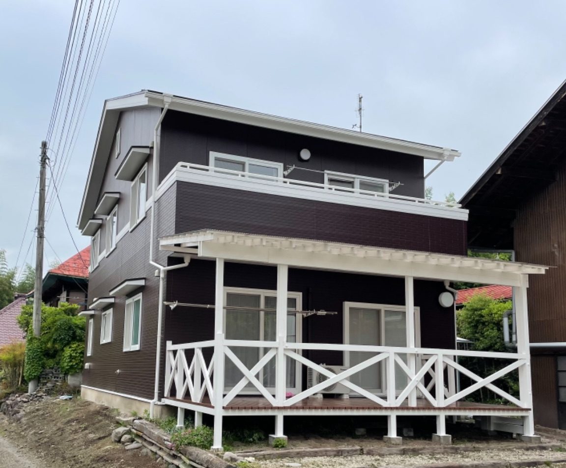 屋根は金属屋根。棟板金部を是正し錆の発生を防ぐ為、錆止めを塗布後上塗り材を2回塗布しました。金属屋根は蓄熱性が高いのでアステックペイントの遮熱塗料を使用。外壁はコーキングを打ち替え、下塗り、上塗り材を2回塗布しました。使用したのは建物への汚れの定着を防ぎ、フッ素塗料を凌ぐ超耐候性で、紫外線などの劣化要因から建物を長期保護する一番人気の低汚染塗料を使用しました。カラーは屋根がキャビアブラウン、外壁がパイオニア。全体的にブラウンでまとめ、幕板や軒天、破風板、デッキなどにホワイトを使用したことにより重くなりすぎず調和のとれたオシャレな外観に仕上がりました。