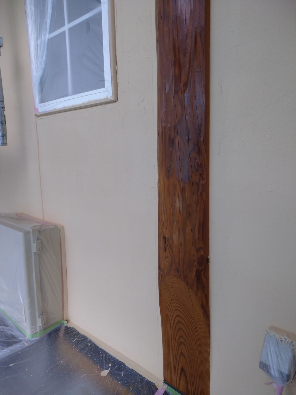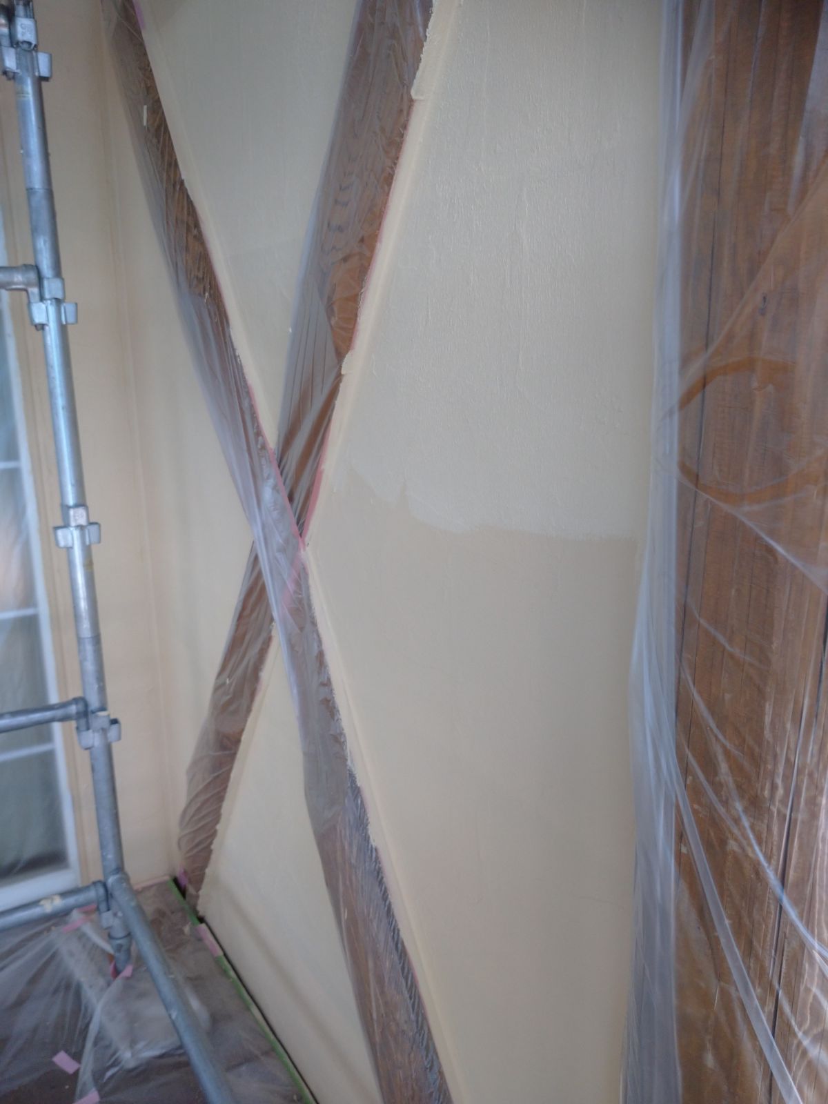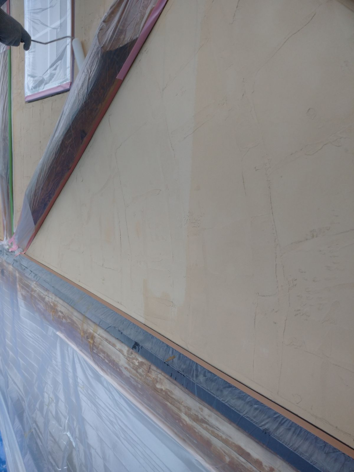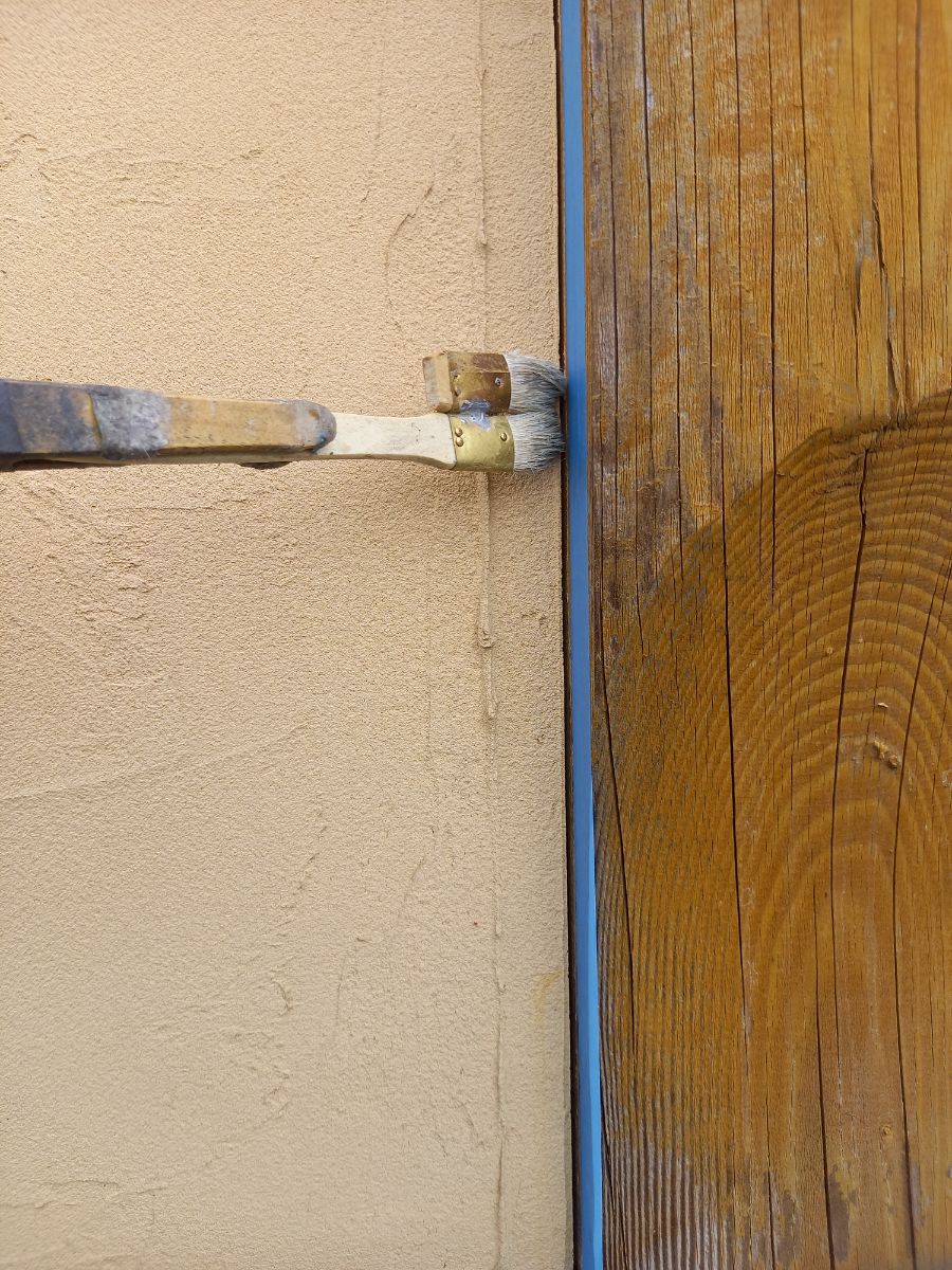 コウモリの侵入があるとのことで木部の隙間をコーキングで埋める作業を行いました。外壁はジョリパットの上質な質感を残したまま施工できるジョリパットフレッシュを使用。カラーは既存の色に近い色をお選びいただきました。木部も経年劣化による色褪せ等多く見られましたので木部保護塗料を塗布しました。
