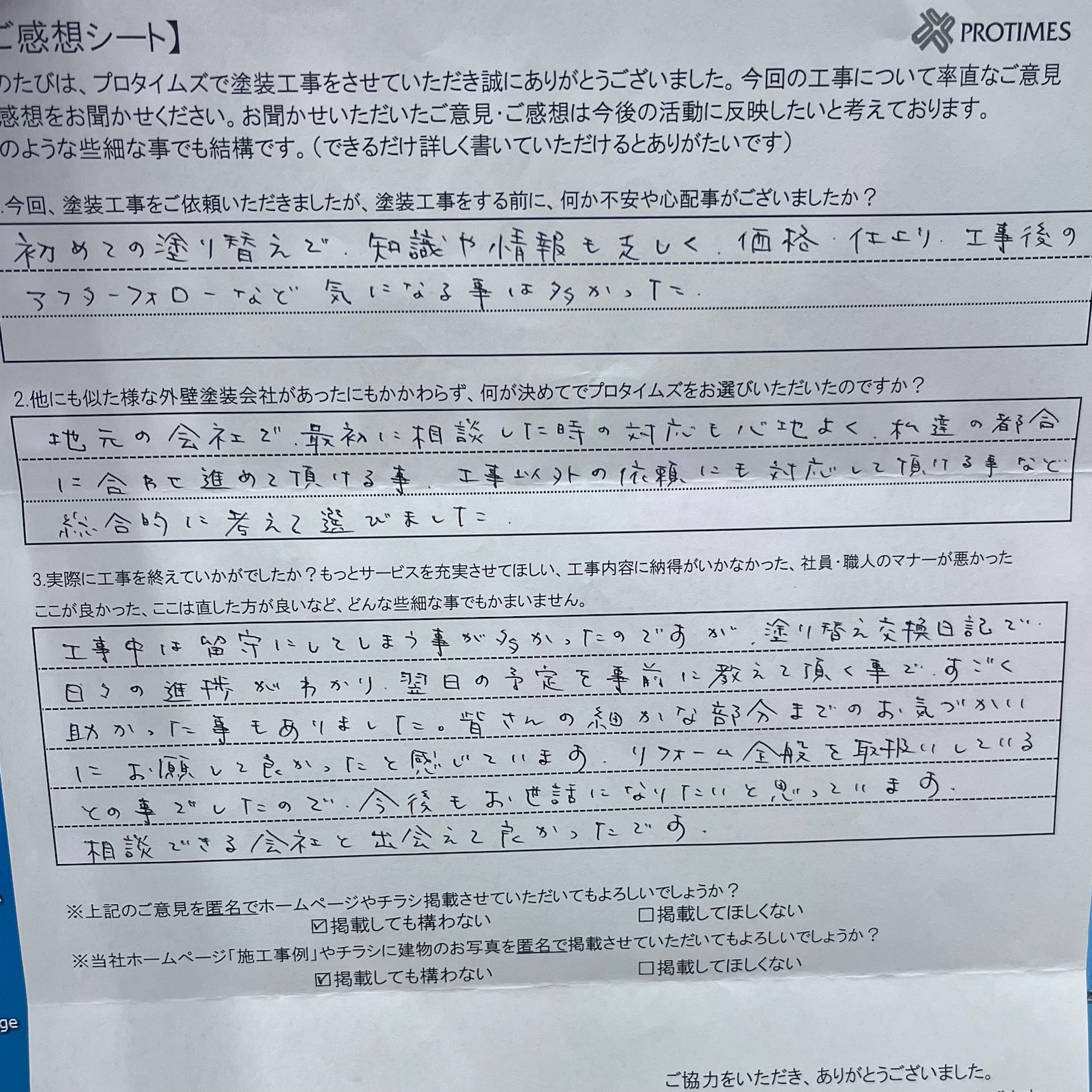 工事中は留守にしてしまう事が多かったのですが、塗り替え交換日記で日々の進捗が分かり翌日の予定を事前に教えて頂く事ですごく助かった事もありました。