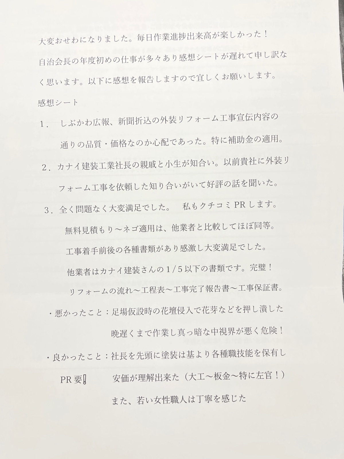 良かったこと:社長を先頭に塗装は基より各種職技能を保有し