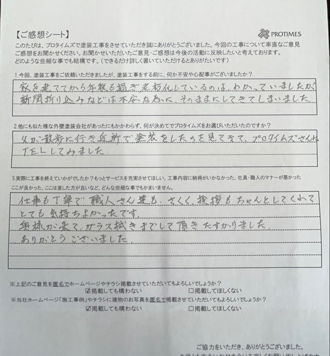 H 様、この度は大変お世話になりました。工事に関わったすべての作業員に対してとても親切に優しく接してくれて写真もたくさん撮影していただきました。私たちの思い出に残る塗り替えとなりました。本当にありがとうございました。