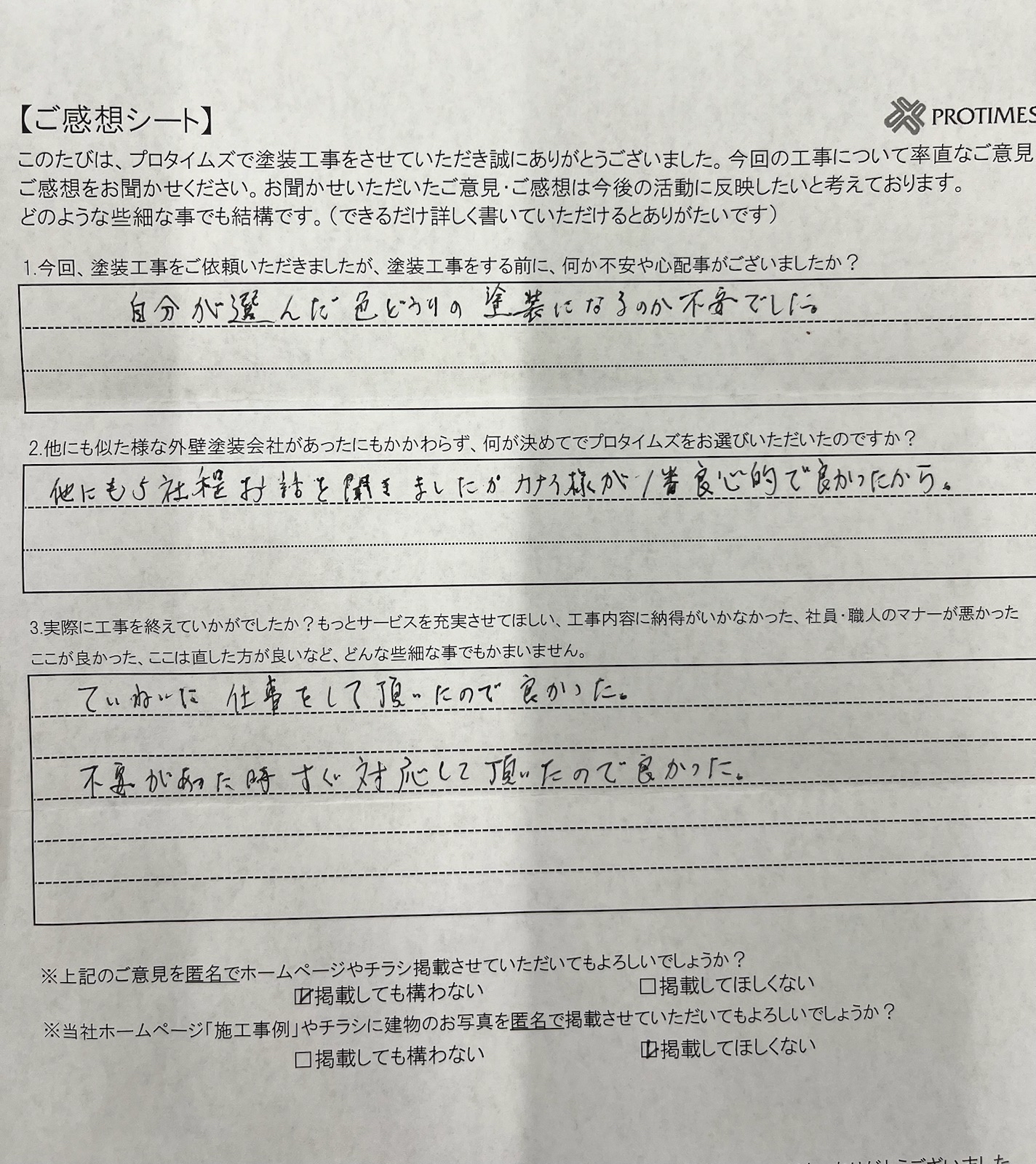 Q:他にも似た様な外壁塗装会社があったにも関わらず、何が決めてでプロタイムズをお選びいただいたのですか?
