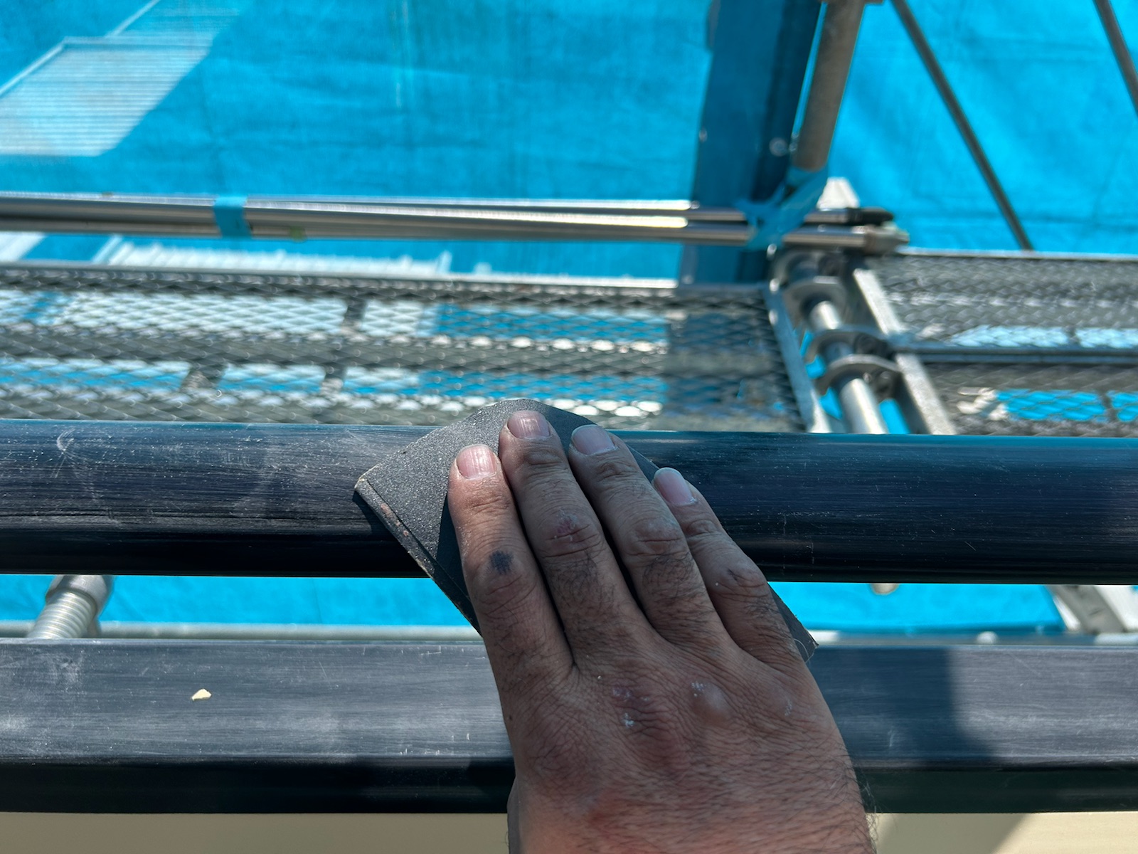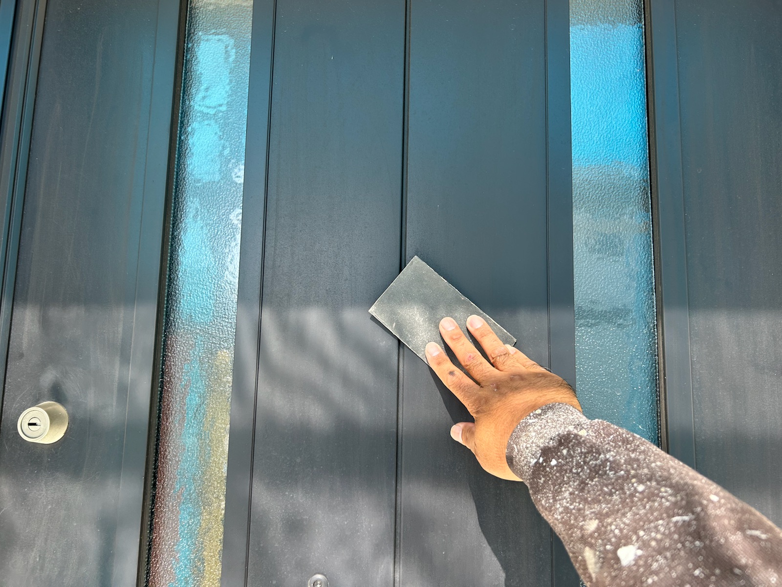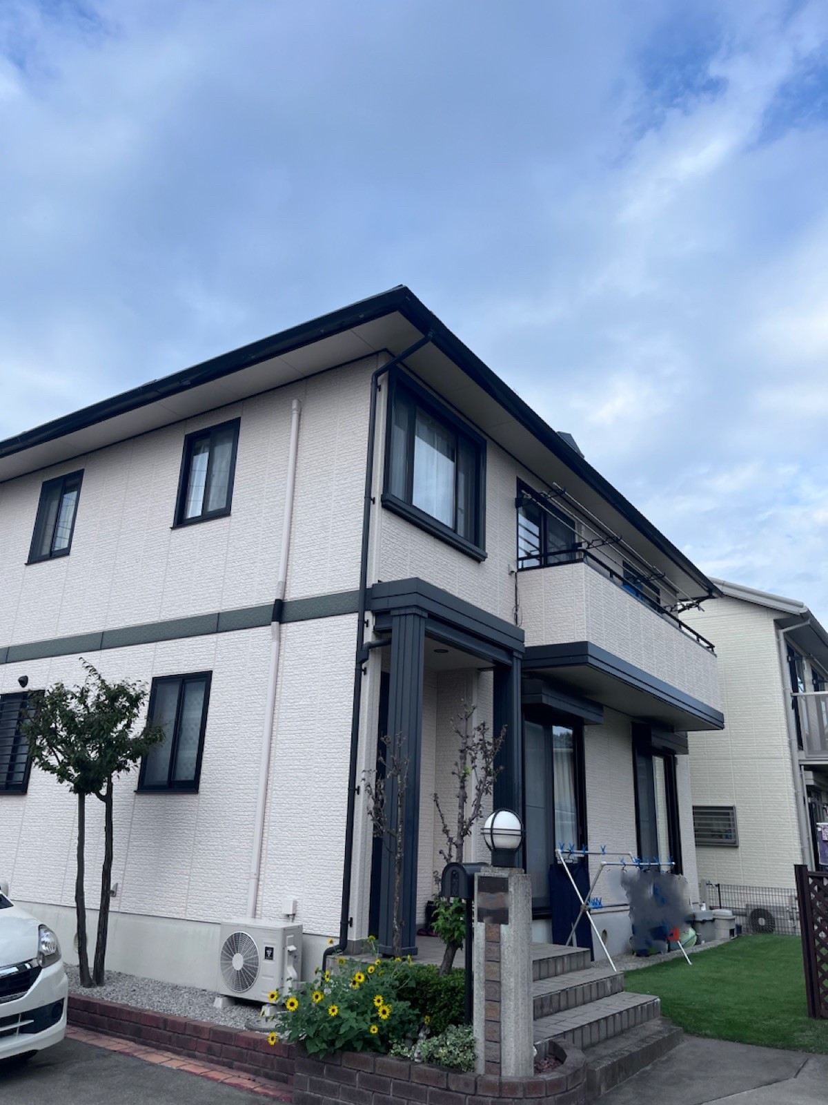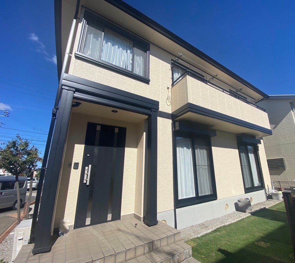 丁度10年前に塗り替え工事をさせていただき、2度目の塗装工事ご依頼いただきました。今回は雹の被害で屋根と特に雨樋の被害が激しく、すべて交換しました。また屋根は今後のことも考え、長期30年保証がついている㈱ディートレーディングのエコグラーニ(カフェ)を使用しカバー工法による改修工事を行いました。外壁は㈱アステックペイントの超低汚染遮熱フッ素塗料を使用。色はペールビスケット。併せて、手摺、玄関ドア、基礎、なども塗装しました。重厚感のある建物に”ペールビスケット”の優しさをプラス。サッシや幕板などは黒で締めて、長期にわたって建物を守る屋根、外壁に生まれ変わりました。