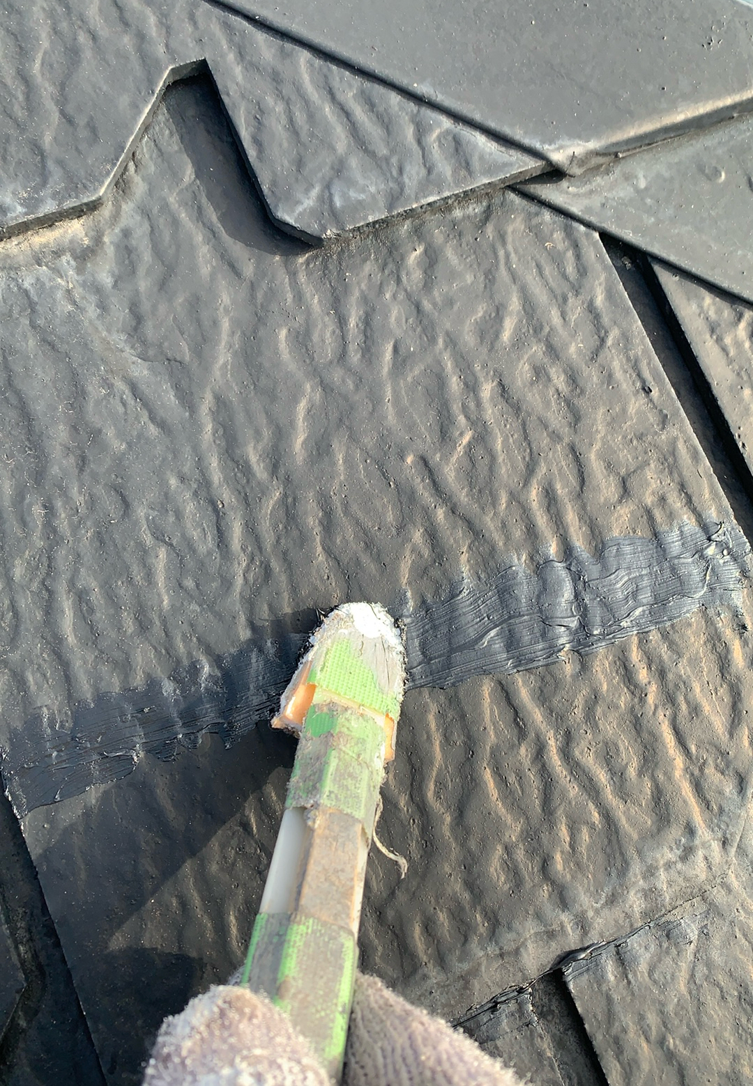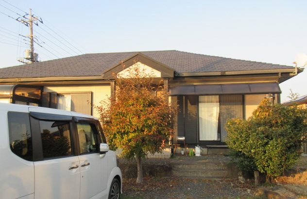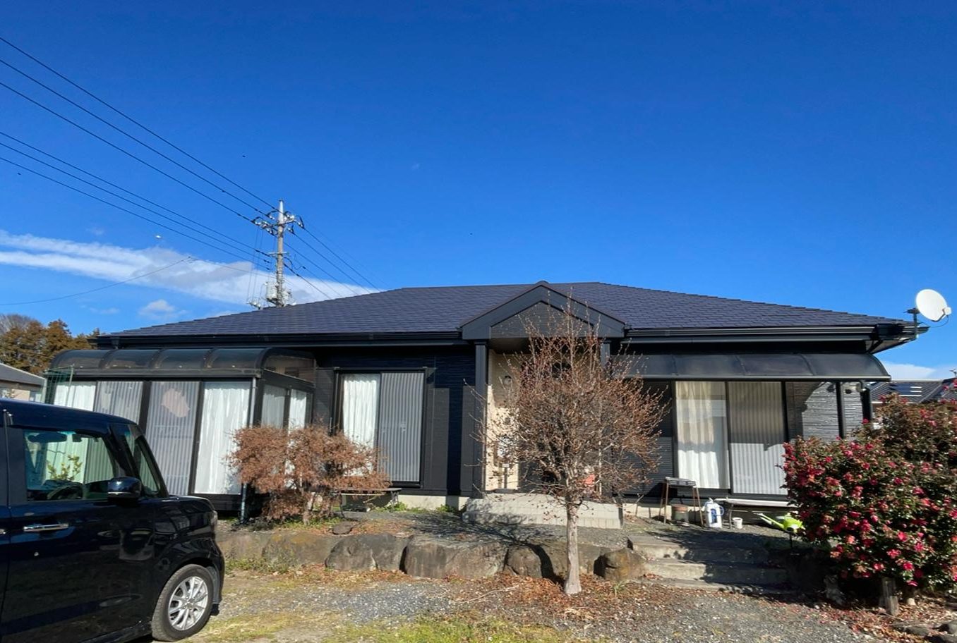屋根はスレート瓦のひび割れや滑落箇所が見られましたので下地処理を行い塗装しました。棟板金は下塗りに錆止めを塗布を塗装しました。外壁はコーキングを打ち替え塗装。玄関周りの外壁のカラーをガラッと変え2色のデザイン塗装にしました。屋根外壁ともにアステックペイントの塗料を使用し、遮熱機能を兼ね備えたエコ住宅に生まれ変わりました。カラーはとても人気のあるチャコール(外壁)。平屋ということもあり重厚感が増しますが、玄関周りをガラッと明るくすることで優しさのあるモダンテイストに。とってもおしゃれな外観に仕上がりました。