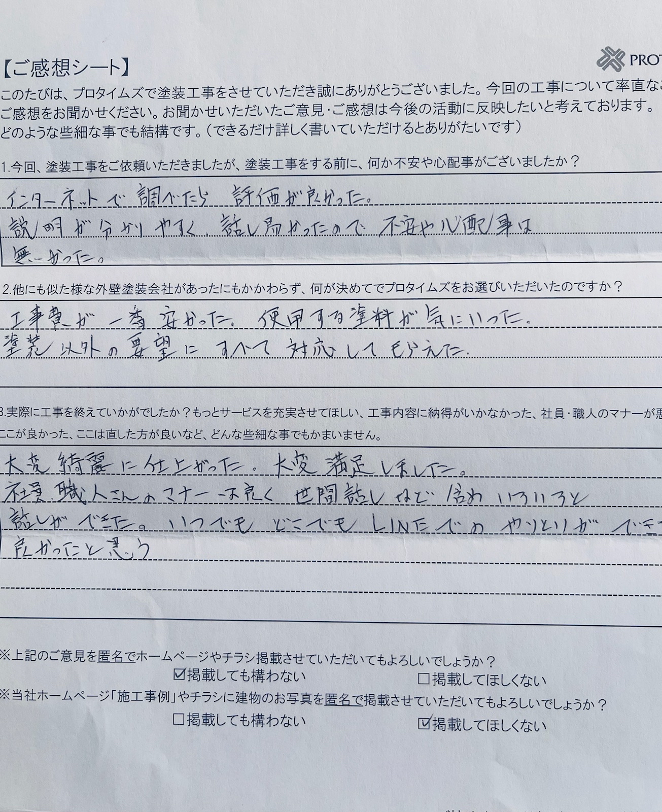 他にも似たような外壁塗装会社があったにもかかわらず、何が決め手でプロタイムズをお選びいただいたのですか?