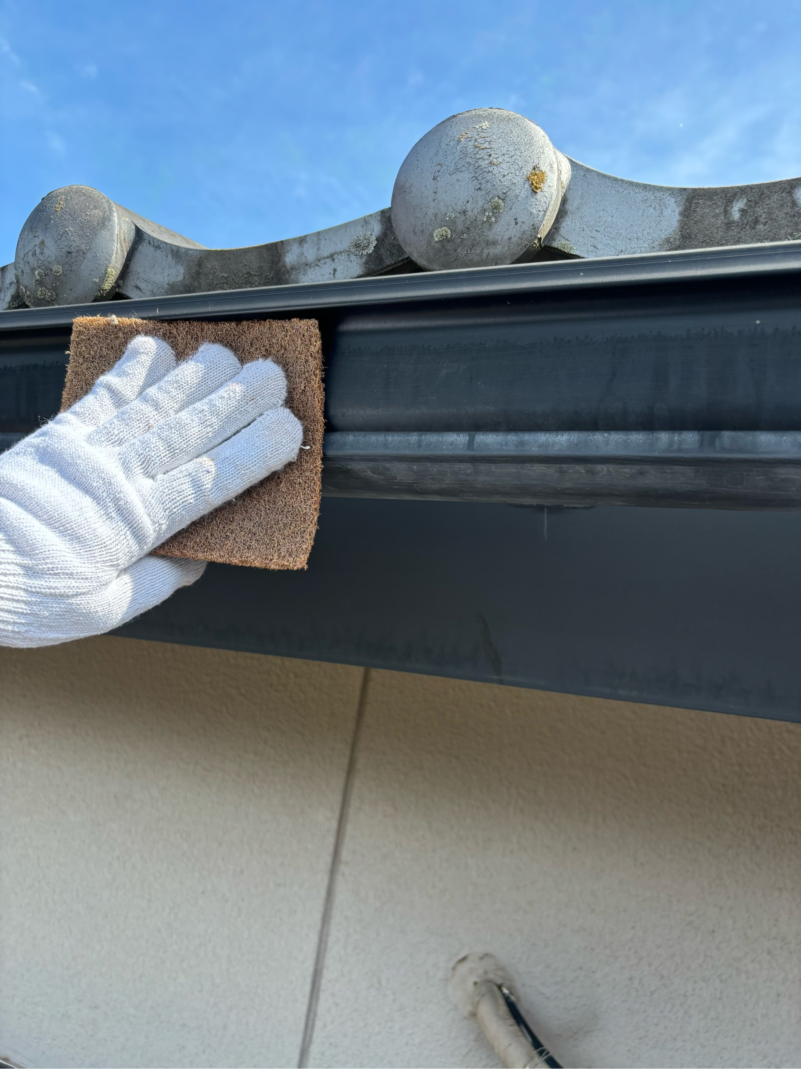 屋根は和瓦。庇など一部板金を使用しており、研磨(ケレン)作業を行った後、錆止めを塗布後上塗り材を2回塗布。外壁はコーキング部を打ち替え、クラック(ひび割れ)補修を行い下地調整の機能を備えたフィラーを塗布後アステックペイントの超低汚染プラチナリファイン2000MF-IRを塗布。紫外線に強いフッ素樹脂と無機成分により高耐侯性を実現し、さらに遮熱機能を兼ね備えた人気塗料です。色はローズベージュを使用しました。付帯部の濃茶系の色が外壁を引き締め、ローズの包み込むような気品ある色合いが和風造りの家にマッチし、落ち着きのある素敵な外観に仕上がりました。
