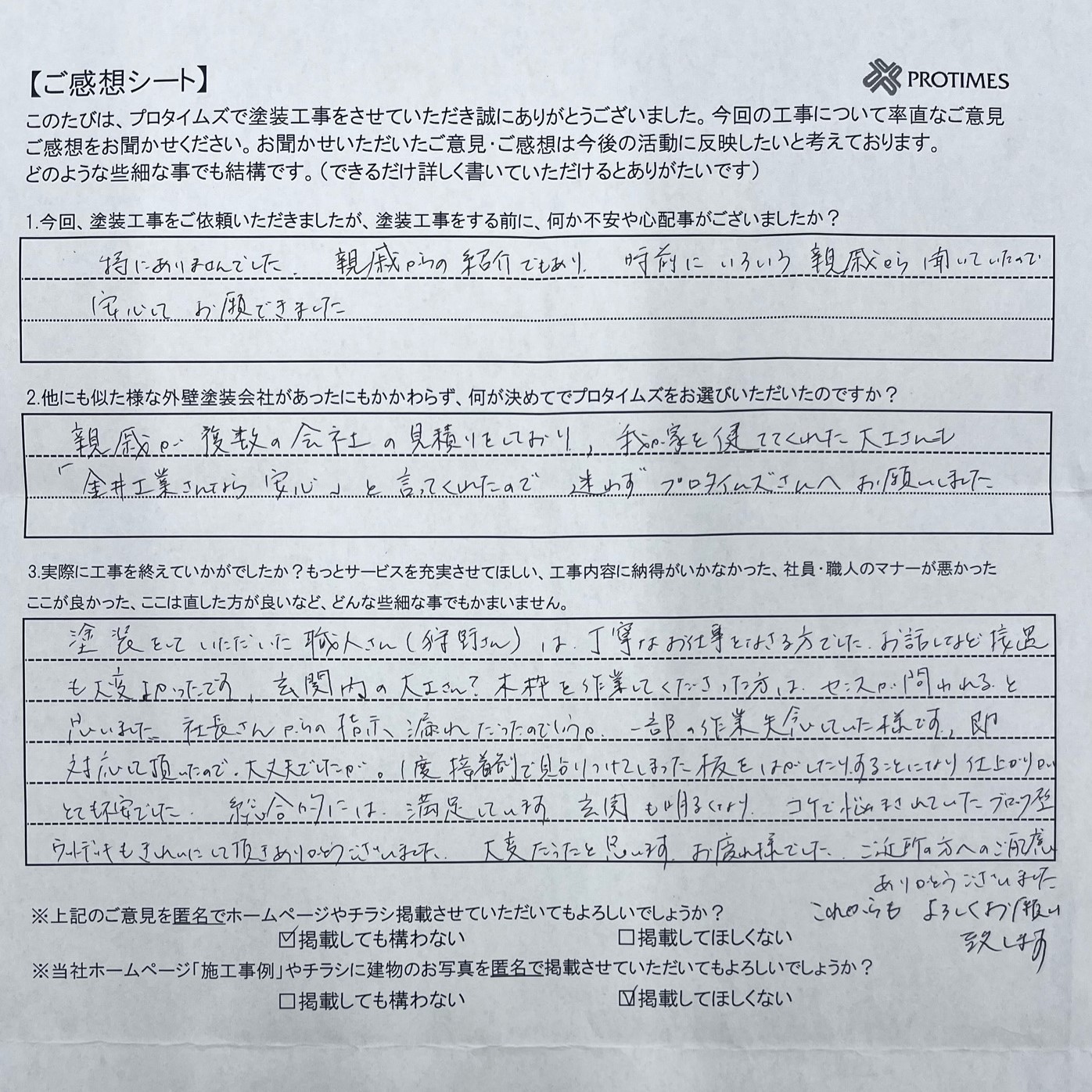 塗装していただいた職人さん(狩野さん)は丁寧なお仕事をなさる方でした。お話など接遇も大変よかったです。玄関内の大工さん?木枠作業をしてくださった方は、センスが問われると思いました。社長さんからの指示漏れだったのでしょう、一部の作業失念していた様です。即、対応して頂いたので大丈夫でしたが。一度接着剤で貼り付けてしまった板をはがしたりすることになり仕上がりがとても不安でした。総合的には満足しています。玄関も明るくなり、コケで悩まされていたブロック壁、ウッドデッキもきれいにしていただきありがとうございました。大変だったと思います。お疲れさまでした。ご近所の配慮ありがとうございました。これからもよろしくお願い致します。