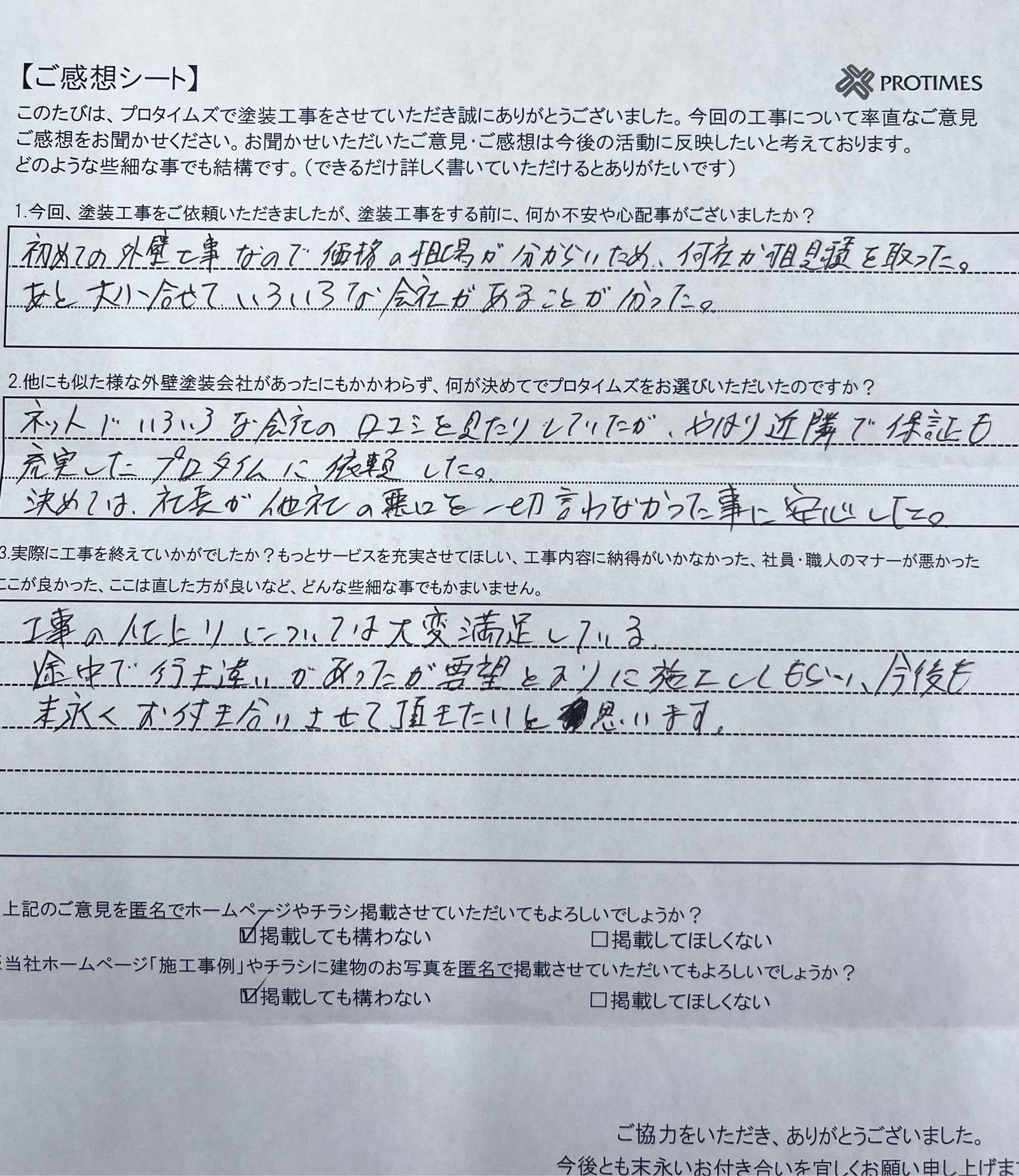 他にも似たような外壁塗装会社があったにもかかわらず、何が決め手でプロタイムズをお選びいただいたのですか?