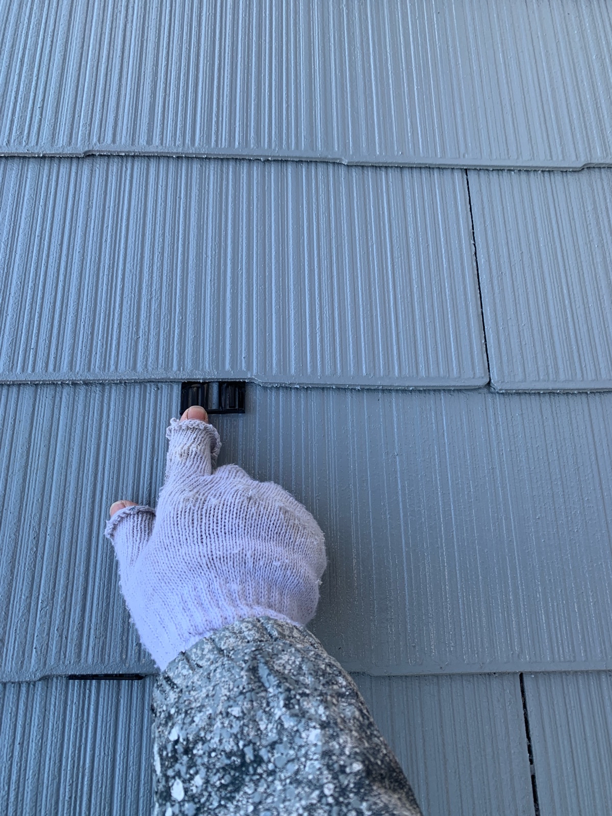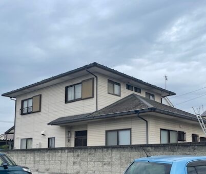 屋根はスレート瓦で塗膜は経年劣化により本来の機能を果たしておらず、雨水などの水分が瓦に吸収されカビやコケの繁殖が多く見られました。また棟板金部のコーキングの割れや一部瓦の割れも確認できました。外壁は全体的にチョーキング現象が見られました。