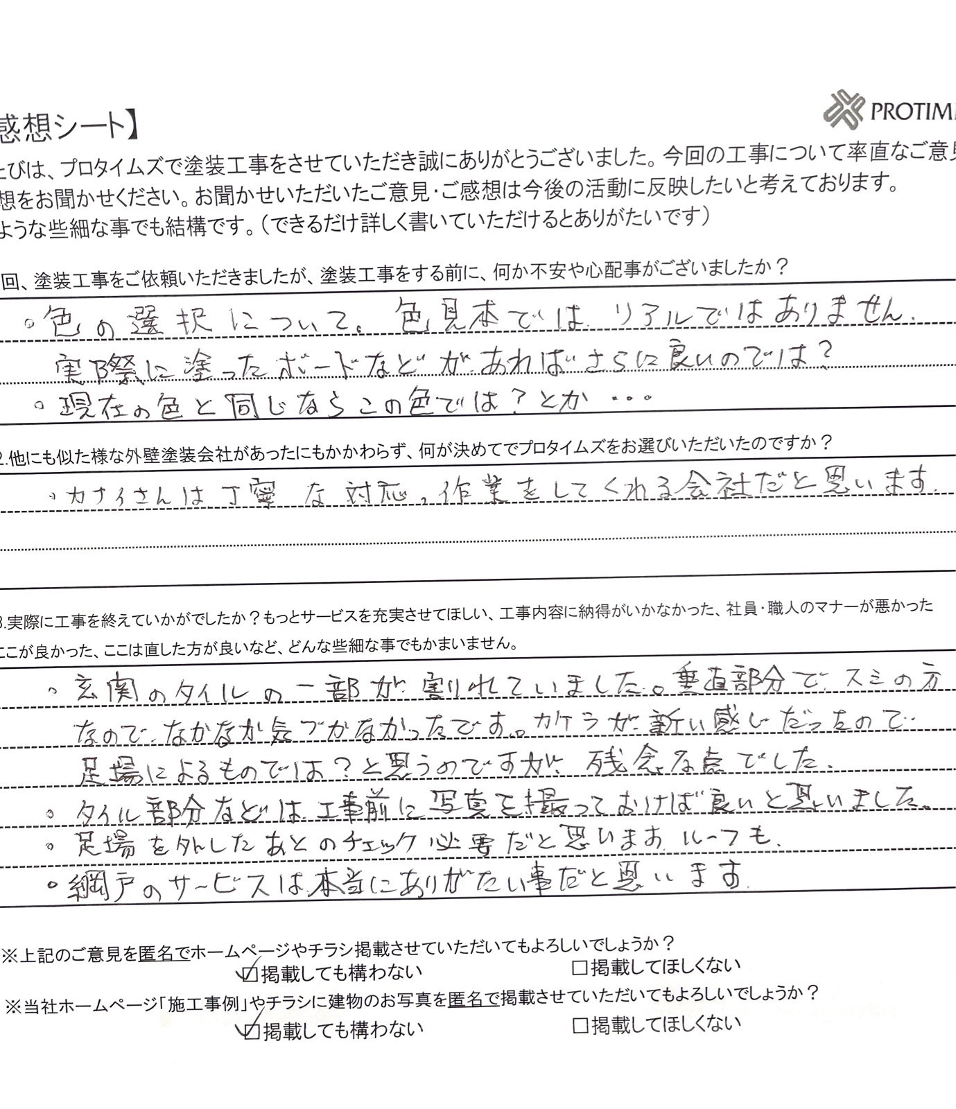 他にも似たような外壁塗装会社があったにもかかわらず、何が決め手でプロタイムズをお選びいただいたのですか?