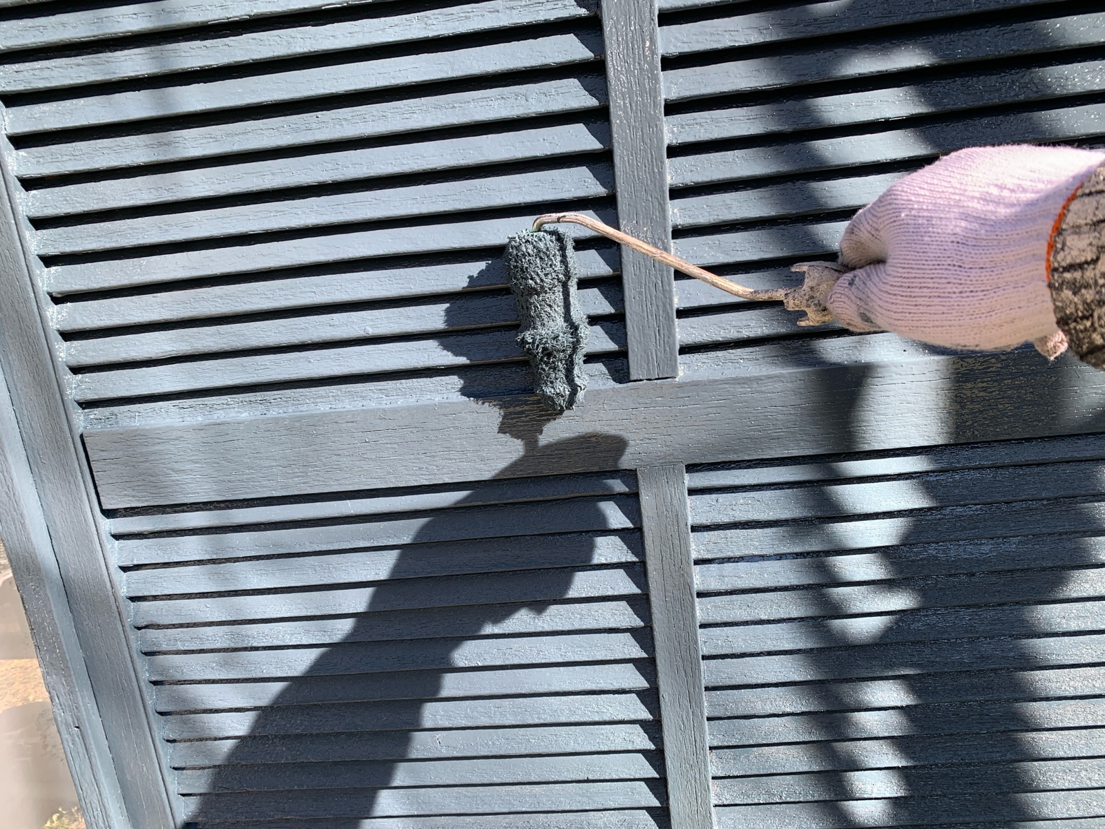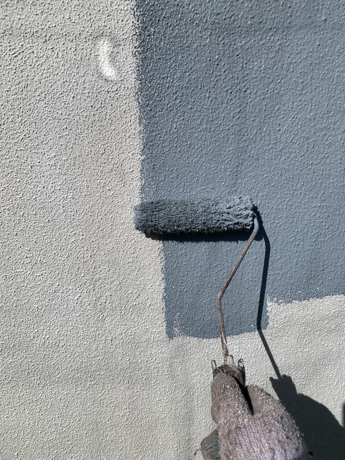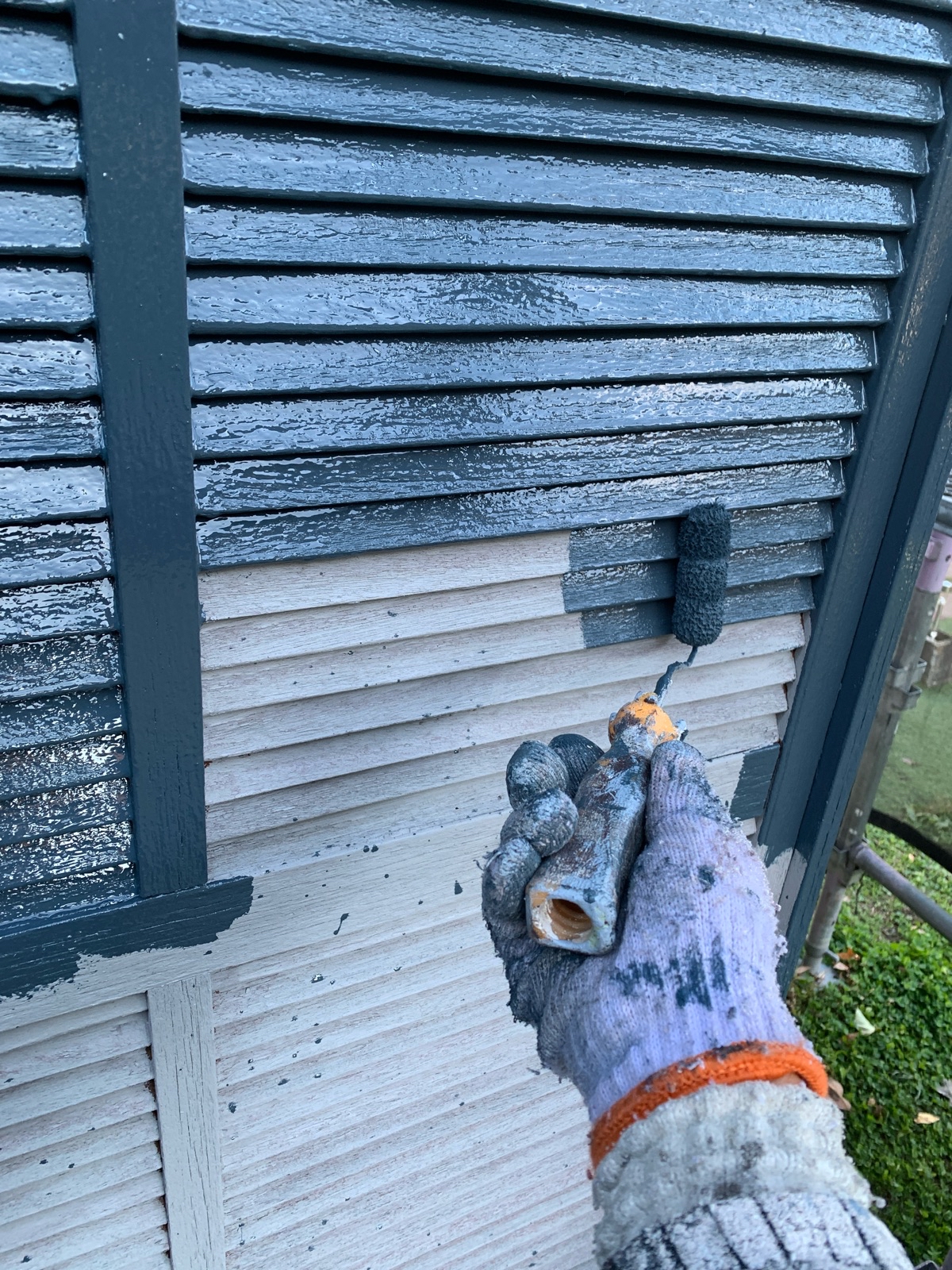 木部は入念にケレン(研磨)をしてから塗装。外壁はひび割れの補修後塗装しました。塗料はアステックペイントの無機塗料を使用。アステックペイントを代表する無機塗料の最高峰と塗料です。特徴としては紫外線などの劣化要因に対し高い耐久性を発揮し、長期に渡って保護します。また変退色防止性にも優れ変退色しにくい特徴を持ち、低汚染、防カビ、遮熱性にも優れたまさに最高峰の塗料。色は外壁全体をブルーグレイ、玄関周りのタイル外壁はブルーグレイに加えマウンテンブルー、バーチグレー3色を使用しデザイン塗装しました。軒天はベビーピンクを使用し優しいアクセントを。併せて玄関ドアを新しく入れ替え、モダンでスタイリッシュな塗装前とは全く違う印象の外観に生まれ変わりました。