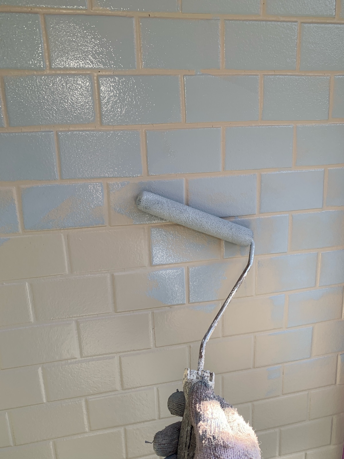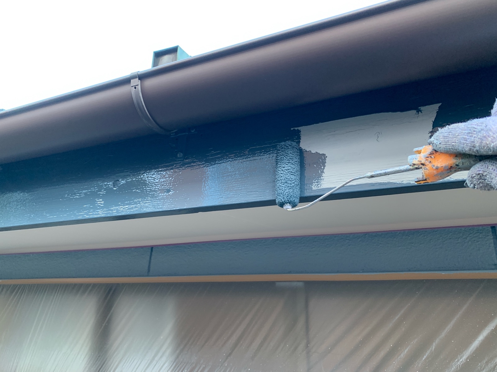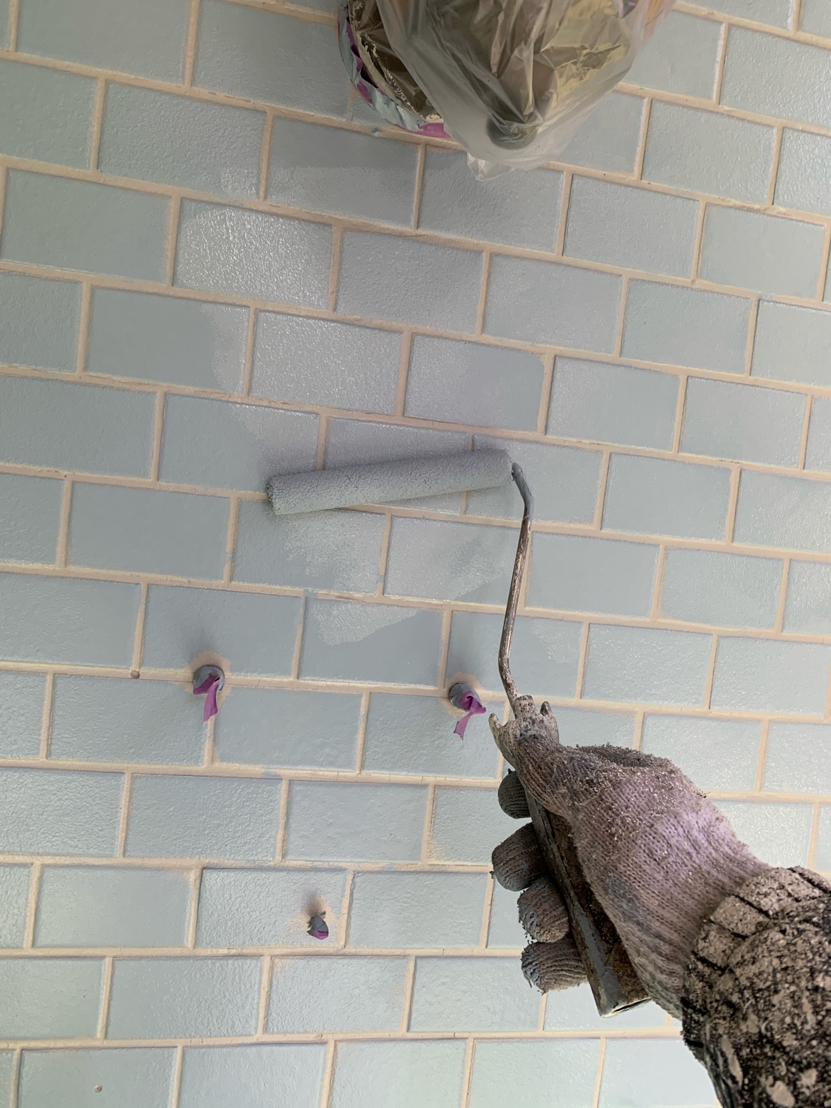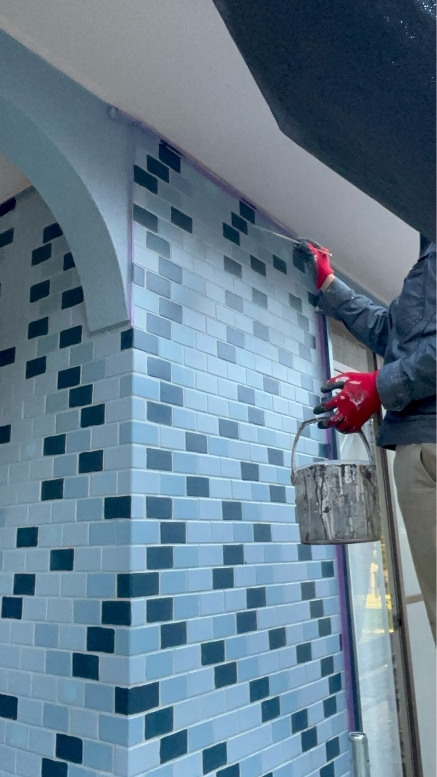 木部は入念にケレン(研磨)をしてから塗装。外壁はひび割れの補修後塗装しました。塗料はアステックペイントの無機塗料を使用。アステックペイントを代表する無機塗料の最高峰と塗料です。特徴としては紫外線などの劣化要因に対し高い耐久性を発揮し、長期に渡って保護します。また変退色防止性にも優れ変退色しにくい特徴を持ち、低汚染、防カビ、遮熱性にも優れたまさに最高峰の塗料。色は外壁全体をブルーグレイ、玄関周りのタイル外壁はブルーグレイに加えマウンテンブルー、バーチグレー3色を使用しデザイン塗装しました。軒天はベビーピンクを使用し優しいアクセントを。併せて玄関ドアを新しく入れ替え、モダンでスタイリッシュな塗装前とは全く違う印象の外観に生まれ変わりました。