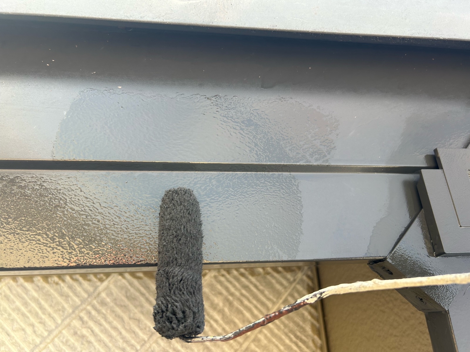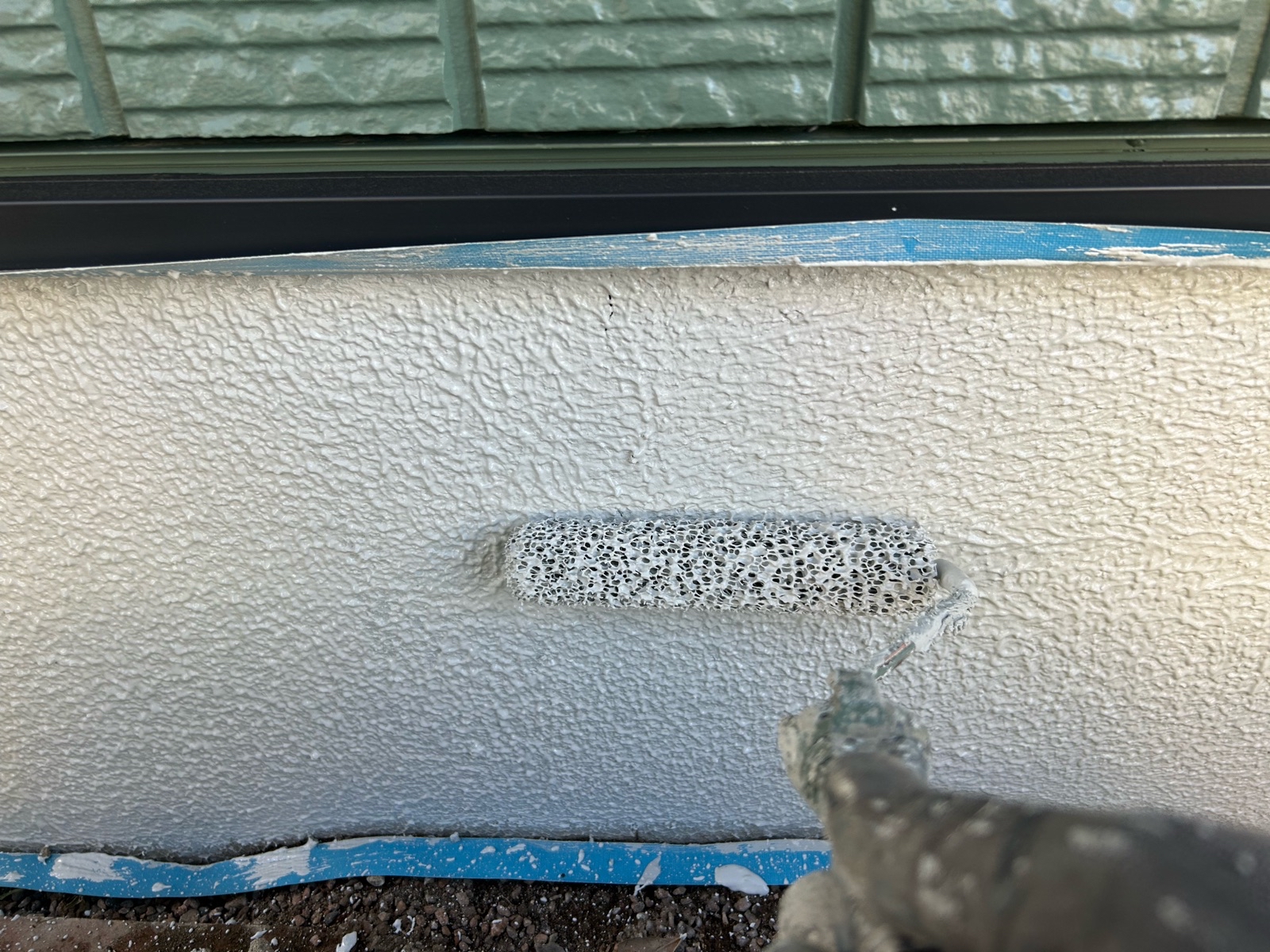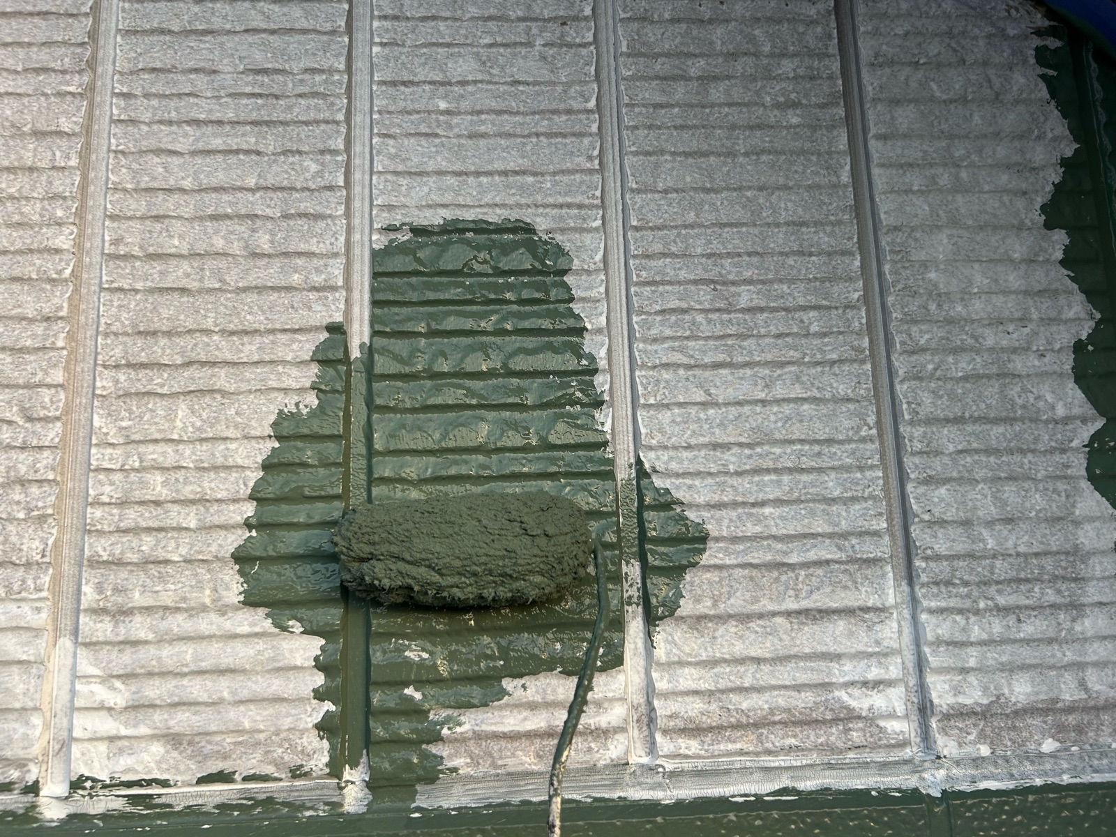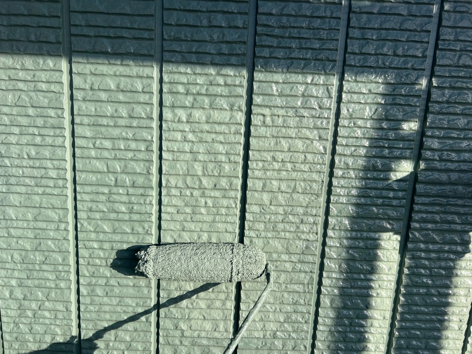 カラーは大判の色見本と合わせてご自身でシュミレーションしていただきました。一色で塗りつぶしましたが、幕板の色とサッシの同系色の差し色が建物全体のグリーン色をより綺麗に引き立てます。