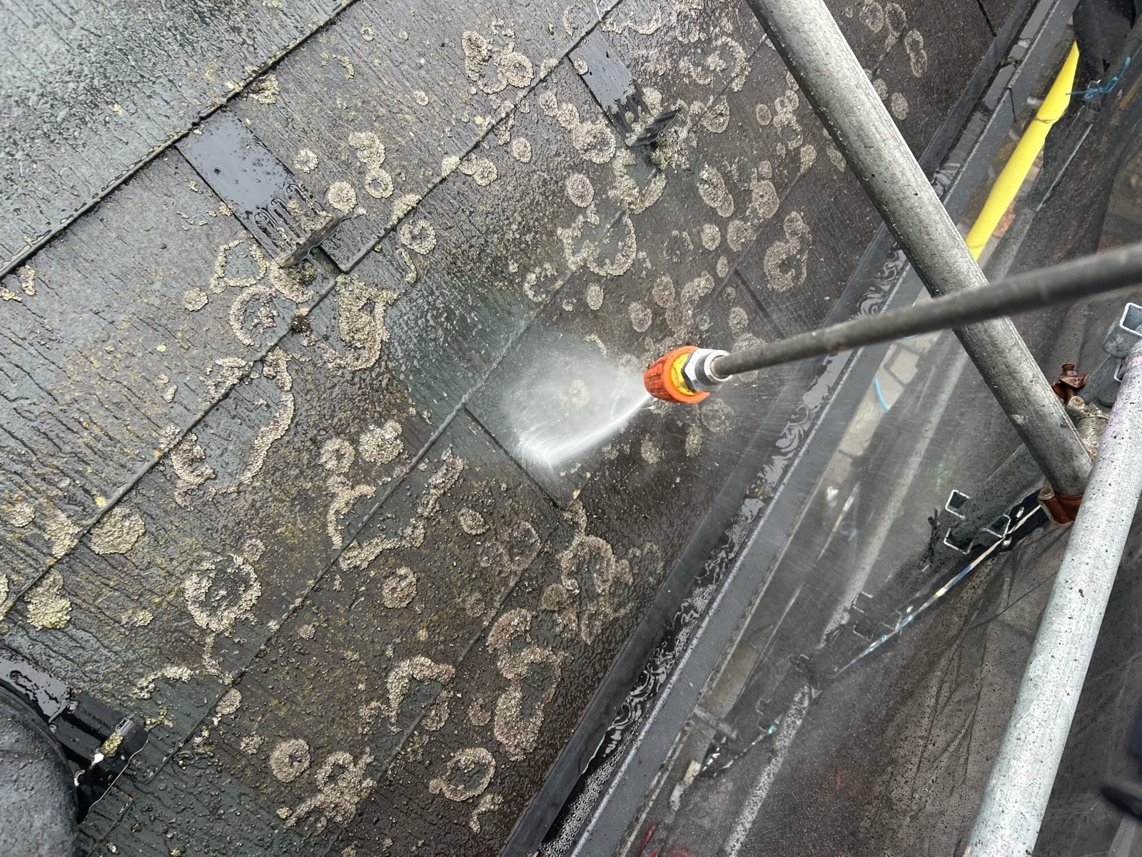 屋根はスレート瓦。経年劣化によりカビの繁殖、瓦の割れが多く見られ、外壁もサイディングの割れや、コーキングの割れ、チョーキングが見られました。特に屋根に関しては、早めにメンテナンスをした方が良い状況でした。