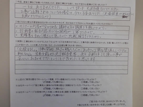 お客様:「交換日記」。仕事の開始、終了の職人さんのご挨拶。丁寧な塗り直し(ベランダや軒天など)。写真を載せた完了報告書等、色々気配りをして頂いた事が安心してお任せできたということで良かったと思います。