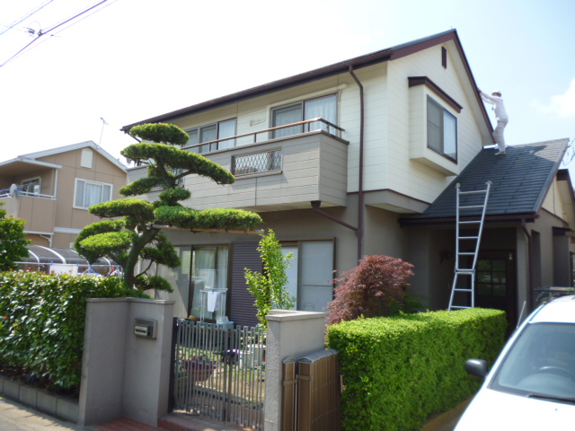 外壁は1階とベランダ、2階を色分けして伸縮率の高い遮熱・防水塗料を、屋根は遮熱塗料を使用して施工させていただきました。