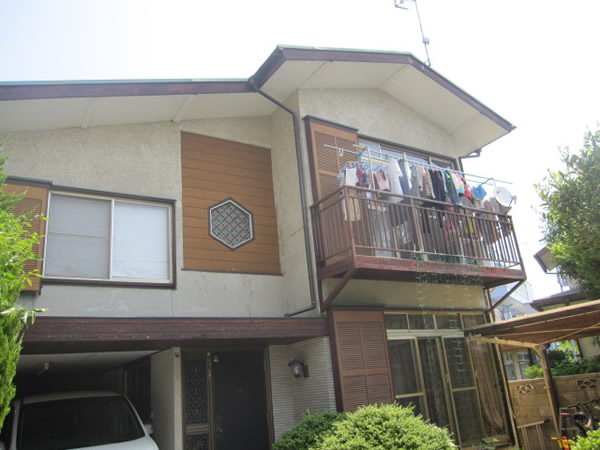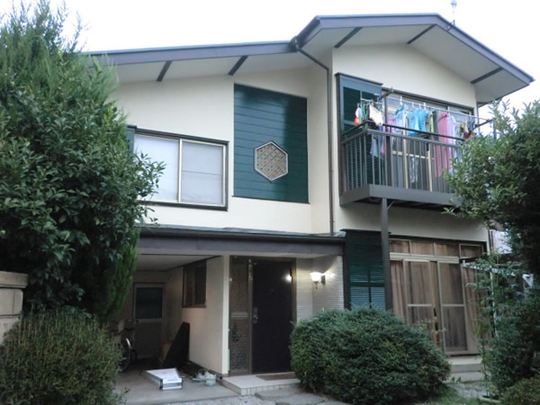 屋根はコロニアルで前回塗装された時の塗膜の剥がれが激しく、カビコケの繁殖もかなりありました。 棟板金も釘が浮いている状態でしたので、旧塗膜はケレン作業でしっかり剥がし、棟板金も是正した後、作業に入りました。 カビの繁殖を防ぐため防カビ材を塗布した後、やはり下塗り材の吸込みが激しかったので、下塗り材も2回塗布しました。 外壁はモルタル部のクラックをしっかり埋めてから塗装しました。 正面の木部・戸袋など、ポイントを深いグリーン色で際立たせモダンでかつポップなイメージに仕上げました。 合わせてベランダをリフォームし、お子様の自転車置場を修繕しました。