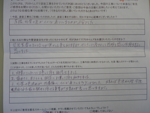 F様:1.非常に丁寧に工事して頂き納得しました。2.藤井さん井上さんも相談によく乗っていただき助かりました。3.外壁の色決めが結構難しくイメージ通りとは多少いかなかった。出来れば色決めの際、実際使用された家を見せて頂ける事等ができれば良いと思いますが。