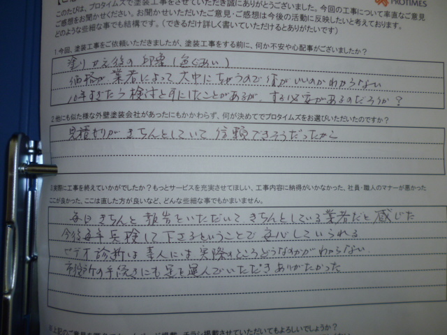 Q:他にも似た様な塗装会社があったにもかかわらず、何が決め手でプロタイムズをお選びいただいたのですか?
