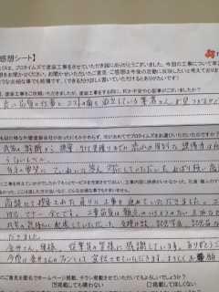 F様:工事の工程表がきちんとできていて、スケジュール通り完了できたことは依頼するものにとっては非常に良かったです。交換日誌を毎日記入し、当日の工事内容、翌日の予定が記入してあり、状況等が把握できてありがたかった。作業の出来具合を細かく点検、修正、予定外の作業まで対応していただき非常に感謝しております。関連する作業、足場の組立、解体は危険を伴う作業であり、ちょっとした事で家屋に損傷を来します。少しの気配りをすることでリフォーム工事も完璧となると思いました。